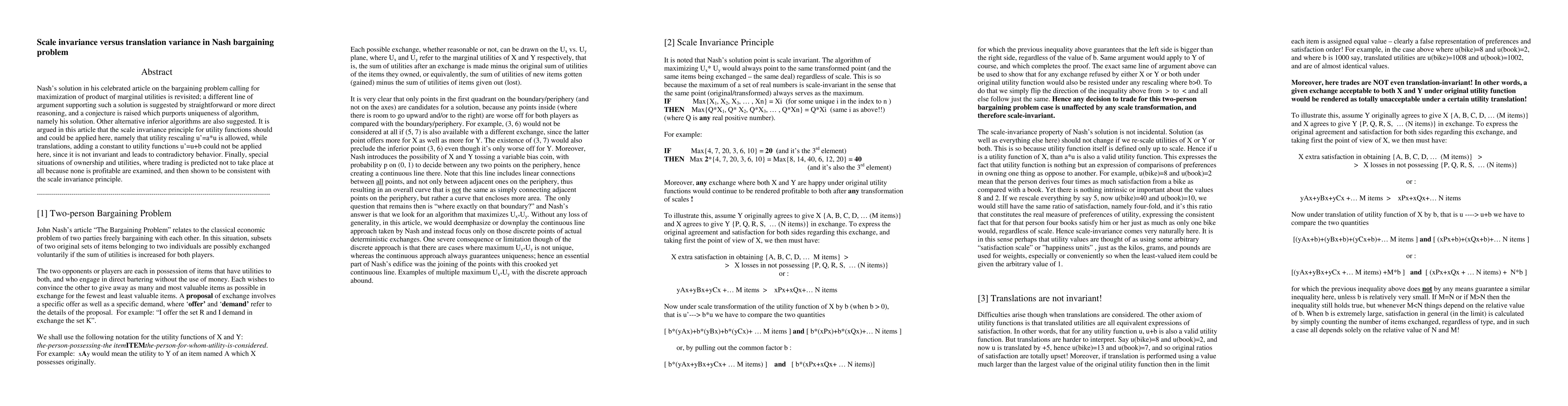This paper revisits Nash's bargaining solution, arguing for its uniqueness through a principle of scale invariance, where utility rescaling is permissible but translation is not. It also explores scenarios where no trade occurs due to lack of profitability, consistent with the scale invariance principle.