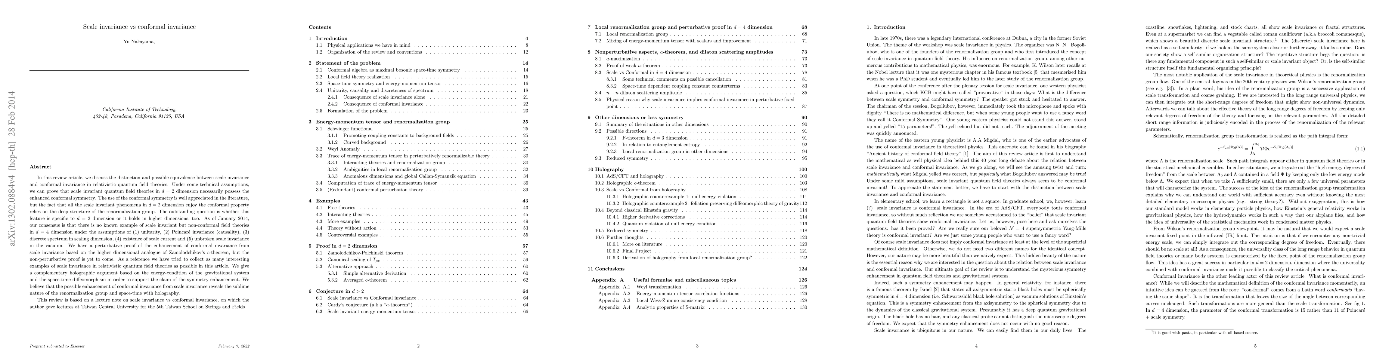 In this review article, we discuss the distinction and possible equivalence between scale invariance and conformal invariance in relativistic quantum field theories. Under some technical assumptions, we can prove that scale invariant quantum field theories in $d=2$ dimension necessarily possess the enhanced conformal symmetry. The use of the conformal symmetry is well appreciated in the literature, but the fact that all the scale invariant phenomena in $d=2$ dimension enjoy the conformal property relies on the deep structure of the renormalization group. The outstanding question is whether this feature is specific to $d=2$ dimension or it holds in higher dimensions, too. As of January 2014, our consensus is that there is no known example of scale invariant but non-conformal field theories in $d=4$ dimension under the assumptions of (1) unitarity, (2) Poincar\'e invariance (causality), (3) discrete spectrum in scaling dimension, (4) existence of scale current and (5) unbroken scale invariance in the vacuum. We have a perturbative proof of the enhancement of conformal invariance from scale invariance based on the higher dimensional analogue of Zamolodchikov's $c$-theorem, but the non-perturbative proof is yet to come. As a reference we have tried to collect as many interesting examples of scale invariance in relativistic quantum field theories as possible in this article. We give a complementary holographic argument based on the energy-condition of the gravitational system and the space-time diffeomorphism in order to support the claim of the symmetry enhancement. We believe that the possible enhancement of conformal invariance from scale invariance reveals the sublime nature of the renormalization group and space-time with holography.