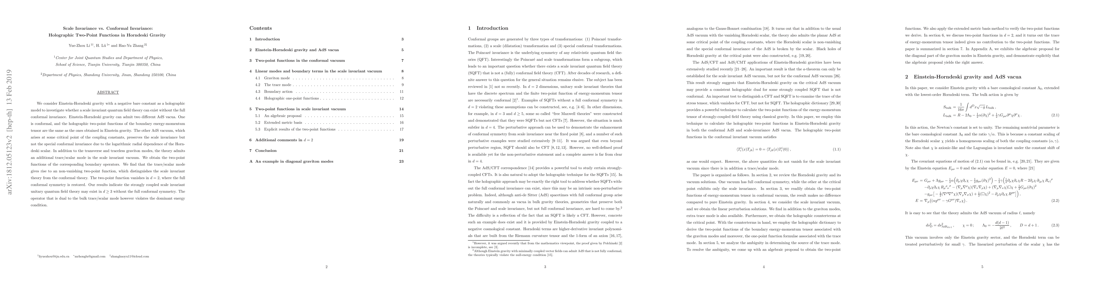 We consider Einstein-Horndeski gravity with a negative bare constant as a holographic model to investigate whether a scale invariant quantum field theory can exist without the full conformal invariance. Einstein-Horndeski gravity can admit two different AdS vacua. One is conformal, and the holographic two-point functions of the boundary energy-momentum tensor are the same as the ones obtained in Einstein gravity. The other AdS vacuum, which arises at some critical point of the coupling constants, preserves the scale invariance but not the special conformal invariance due to the logarithmic radial dependence of the Horndeski scalar. In addition to the transverse and traceless graviton modes, the theory admits an additional trace/scalar mode in the scale invariant vacuum. We obtain the two-point functions of the corresponding boundary operators. We find that the trace/scalar mode gives rise to an non-vanishing two-point function, which distinguishes the scale invariant theory from the conformal theory. The two-point function vanishes in $d=2$, where the full conformal symmetry is restored. Our results indicate the strongly coupled scale invariant unitary quantum field theory may exist in $d\ge 3$ without the full conformal symmetry. The operator that is dual to the bulk trace/scalar mode however violates the dominant energy condition.
