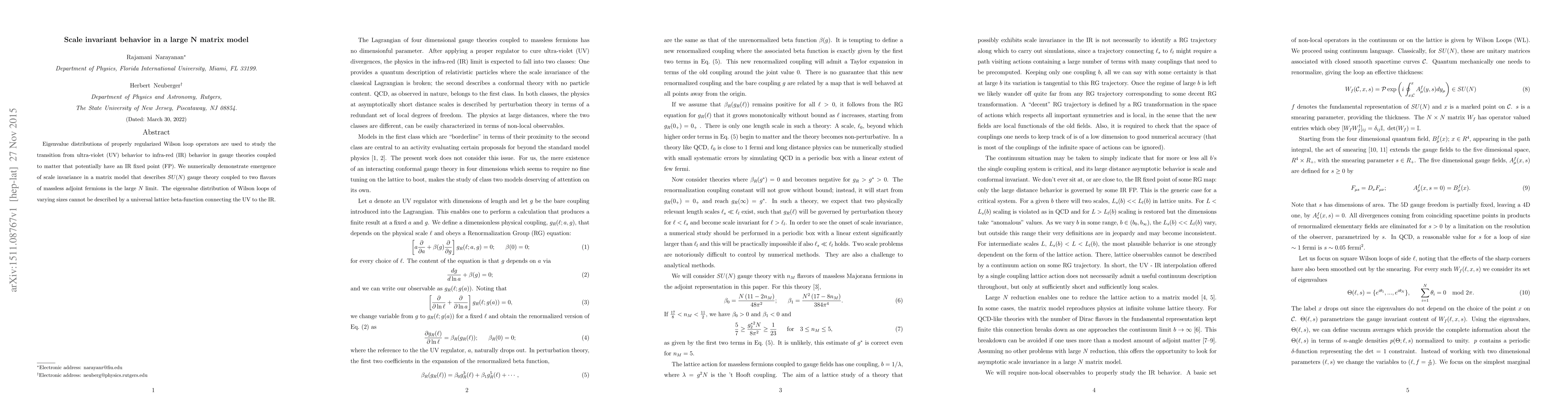 Eigenvalue distributions of properly regularized Wilson loop operators are used to study the transition from ultra-violet (UV) behavior to infra-red (IR) behavior in gauge theories coupled to matter that potentially have an IR fixed point (FP). We numerically demonstrate emergence of scale invariance in a matrix model that describes $SU(N)$ gauge theory coupled to two flavors of massless adjoint fermions in the large $N$ limit. The eigenvalue distribution of Wilson loops of varying sizes cannot be described by a universal lattice beta-function connecting the UV to the IR.