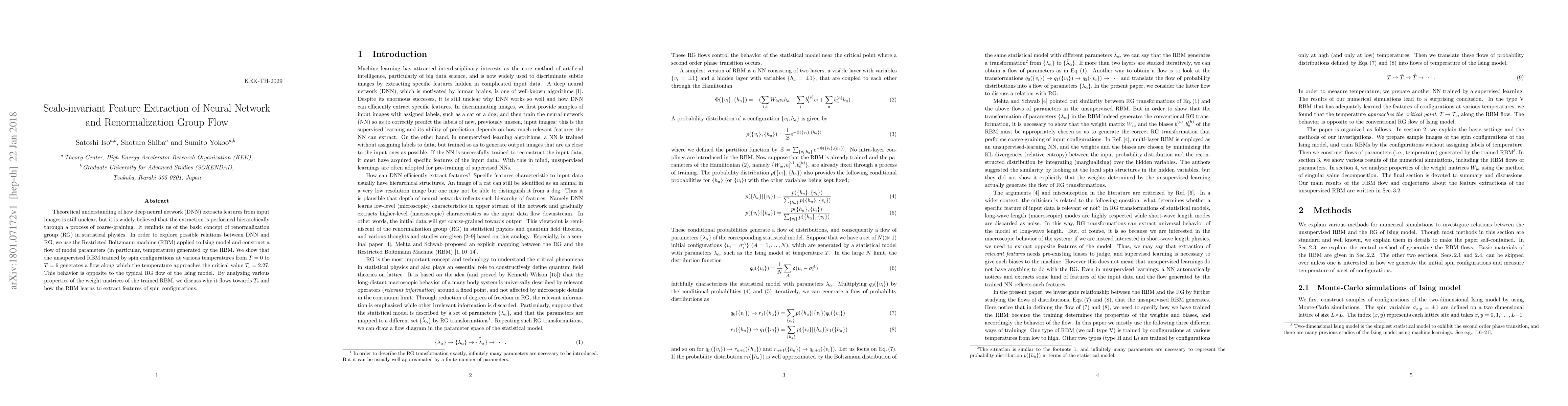 Theoretical understanding of how deep neural network (DNN) extracts features from input images is still unclear, but it is widely believed that the extraction is performed hierarchically through a process of coarse-graining. It reminds us of the basic concept of renormalization group (RG) in statistical physics. In order to explore possible relations between DNN and RG, we use the Restricted Boltzmann machine (RBM) applied to Ising model and construct a flow of model parameters (in particular, temperature) generated by the RBM. We show that the unsupervised RBM trained by spin configurations at various temperatures from $T=0$ to $T=6$ generates a flow along which the temperature approaches the critical value $T_c=2.27$. This behavior is opposite to the typical RG flow of the Ising model. By analyzing various properties of the weight matrices of the trained RBM, we discuss why it flows towards $T_c$ and how the RBM learns to extract features of spin configurations.
