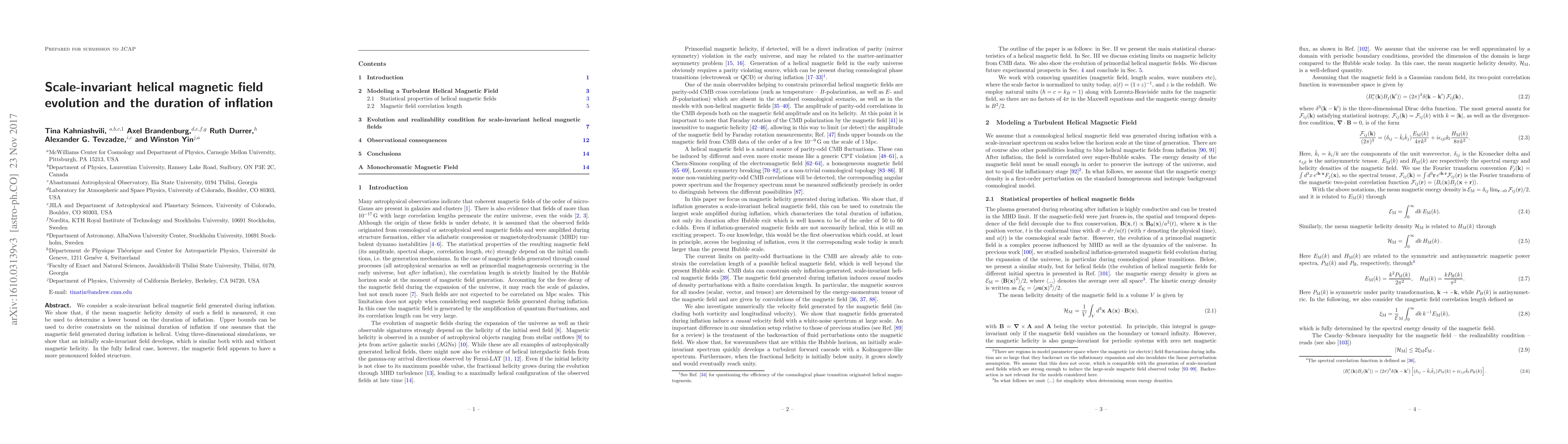 We consider a scale-invariant helical magnetic field generated during inflation. We show that, if the mean magnetic helicity density of such a field is measured, it can be used to determine a lower bound on the duration of inflation. Upper bounds can be used to derive constraints on the minimal duration of inflation if one assumes that the magnetic field generated during inflation is helical. Using three-dimensional simulations, we show that an initially scale-invariant field develops, which is similar both with and without magnetic helicity. In the fully helical case, however, the magnetic field appears to have a more pronounced folded structure.