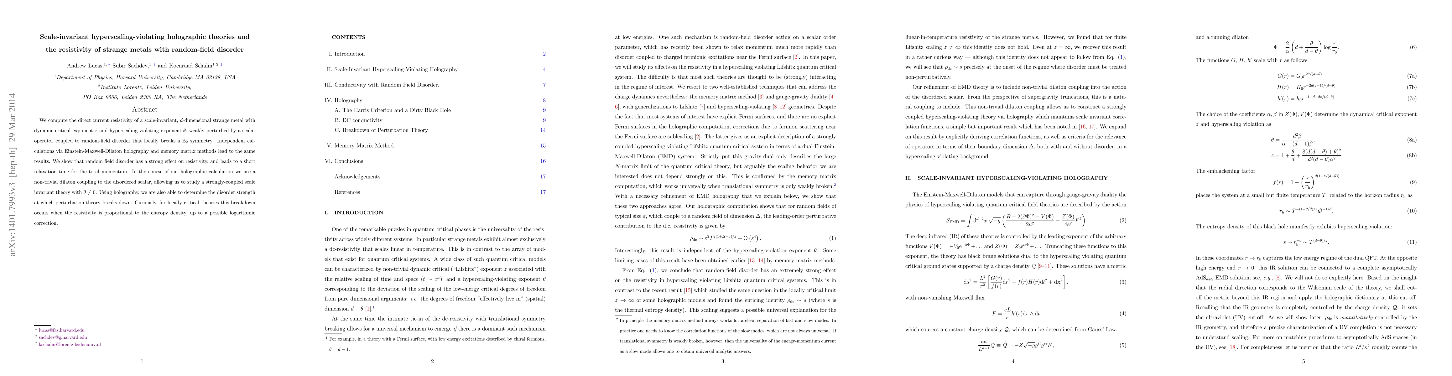 We compute the direct current resistivity of a scale-invariant, $d$-dimensional strange metal with dynamic critical exponent $z$ and hyperscaling-violating exponent $\theta$, weakly perturbed by a scalar operator coupled to random-field disorder that locally breaks a $\mathbb{Z}_2$ symmetry. Independent calculations via Einstein-Maxwell-Dilaton holography and memory matrix methods lead to the same results. We show that random field disorder has a strong effect on resistivity: charge carriers in the infrared are easily depleted, as the relaxation time for momentum is surprisingly small. In the course of our holographic calculation we use a non-trivial dilaton coupling to the disordered scalar, allowing us to study a strongly-coupled scale invariant theory with $\theta \ne 0$. Using holography, we are also able to determine the disorder strength at which perturbation theory breaks down. Curiously, for locally critical theories this breakdown occurs when the resistivity is proportional to the entropy density, up to a possible logarithmic correction.