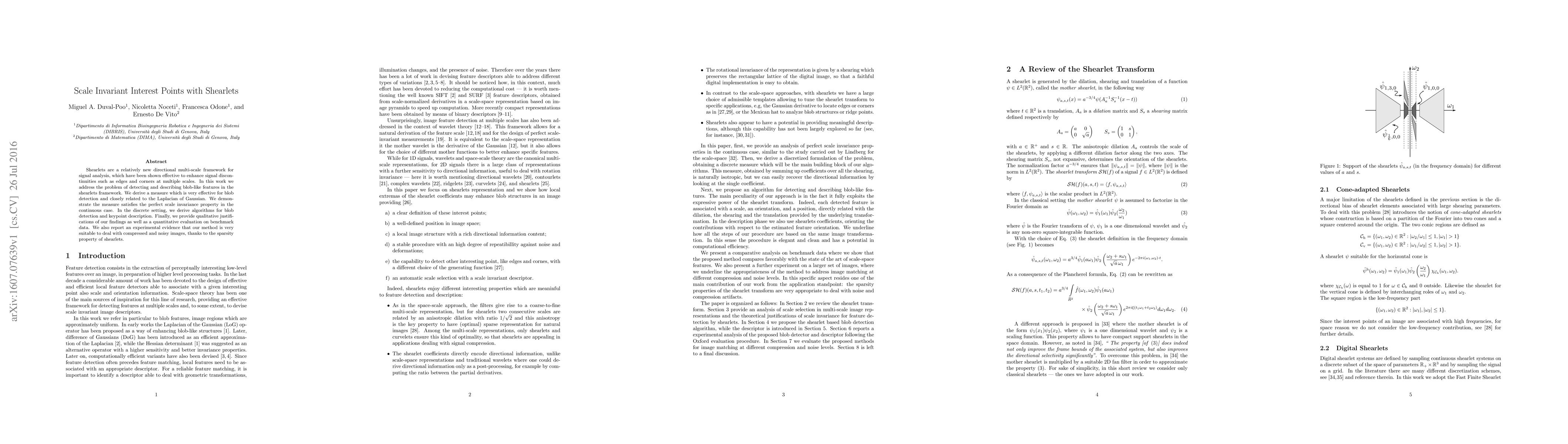 This paper develops a shearlet-based method for detecting and describing blob-like features, introducing a scale invariant measure akin to the Laplacian of Gaussian. The method is shown to be effective in noisy and compressed images due to the sparsity of shearlets.
