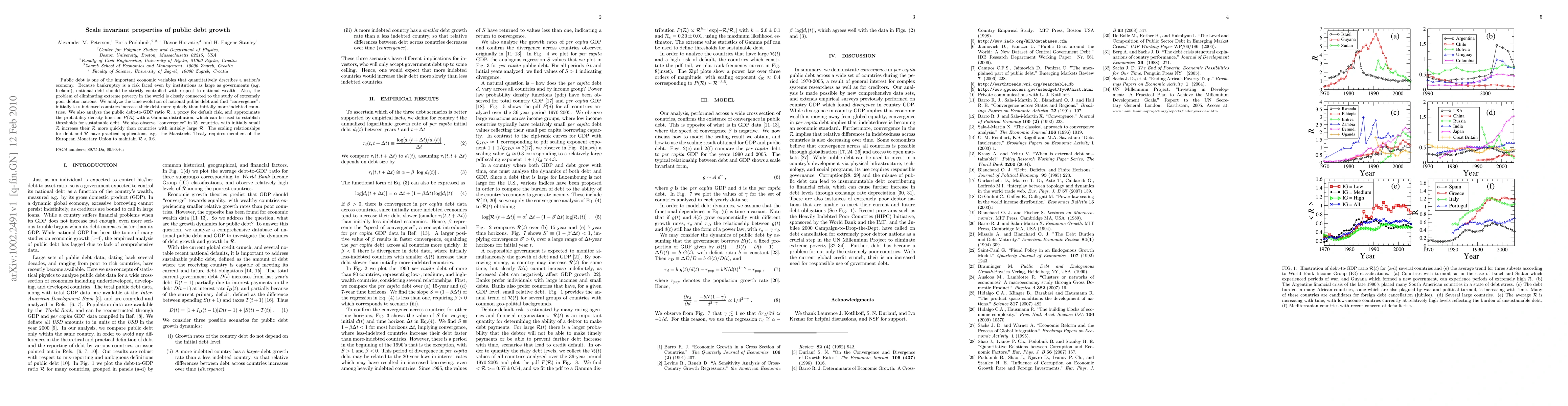 Public debt is one of the important economic variables that quantitatively describes a nation's economy. Because bankruptcy is a risk faced even by institutions as large as governments (e.g. Iceland), national debt should be strictly controlled with respect to national wealth. Also, the problem of eliminating extreme poverty in the world is closely connected to the study of extremely poor debtor nations. We analyze the time evolution of national public debt and find "convergence": initially less-indebted countries increase their debt more quickly than initially more-indebted countries. We also analyze the public debt-to-GDP ratio R, a proxy for default risk, and approximate the probability density function P(R) with a Gamma distribution, which can be used to establish thresholds for sustainable debt. We also observe "convergence" in R: countries with initially small R increase their R more quickly than countries with initially large R. The scaling relationships for debt and R have practical applications, e.g. the Maastricht Treaty requires members of the European Monetary Union to maintain R < 0.6.