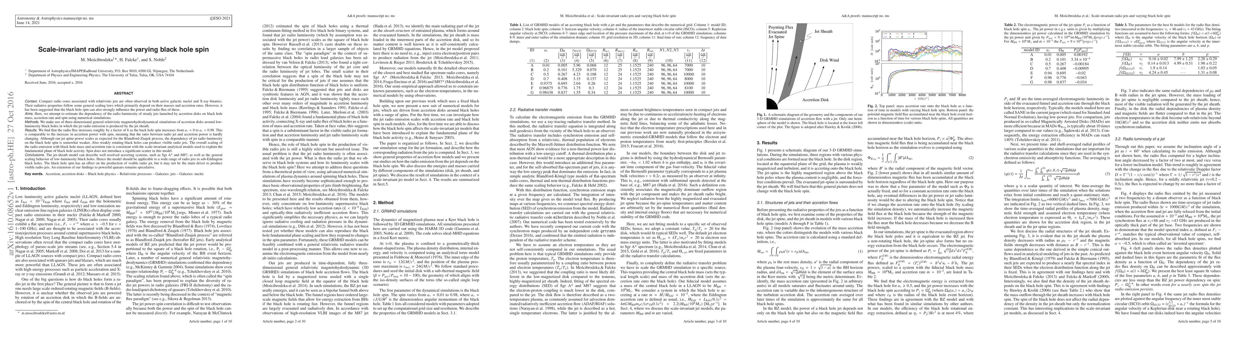 Compact radio cores associated with relativistic jets are often observed in both active galactic nuclei and X-ray binaries. Their radiative properties follow some general scaling laws which primarily depend on their masses and accretion rates. However, it has been suggested that the black hole spin can also strongly influence the power and radio flux of these. Here, we attempt to estimate the dependency of the radio luminosity of steady jets launched by accretion disks on black hole mass, accretion rate and spin using numerical simulations. We make use of 3D GRMHD simulations of accretion disks around low-luminosity black holes in which the jet radio emission is produced by the jet sheath. We find that the radio flux increases roughly by a factor of 6 as the back hole spin increases from a~0 to a=0.98. This is comparable to the increase in accretion power with spin, meaning that the ratio between radio jet and accretion power is hardly changing. Although our jet spine power scales as expected for the Blandford-Znajek process, the dependency of jet radio luminosity on the black hole spin is somewhat weaker. Also weakly rotating black holes can produce visible radio jets. The overall scaling of the radio emission with black hole mass and accretion rate is consistent with the scale-invariant analytical models used to explain the fundamental plane of black hole activity. Spin does not introduce a significant scatter in this model. The jet-sheath model can describe well resolved accreting systems, such as SgrA* and M87, as well as the general scaling behavior of low-luminosity black holes. Hence the model should be applicable to a wide range of radio jets in sub-Eddington black holes. The black hole spin has an effect on the production of visible radio jet, but it may not be the main driver to produce visible radio jets. An extension of our findings to powerful quasars remains speculative.