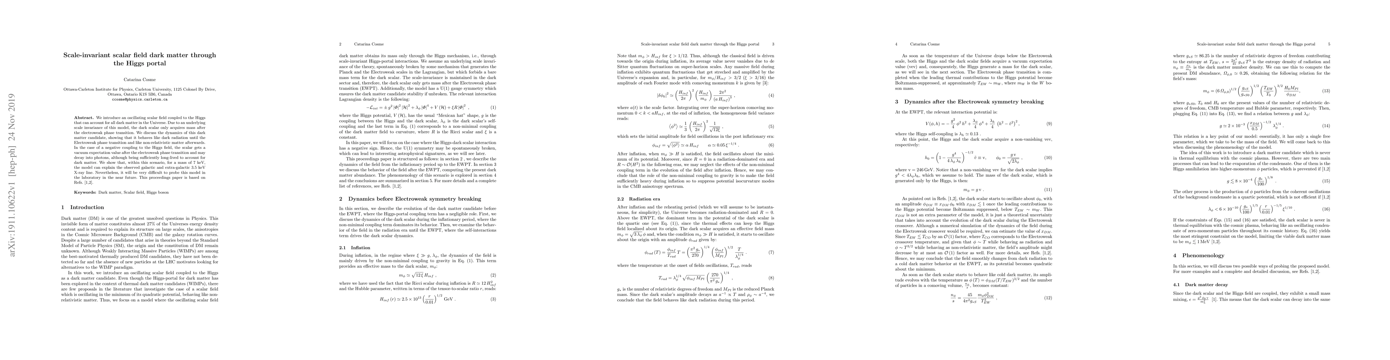 This paper proposes a scale-invariant scalar field dark matter model connected to the Higgs via the Higgs portal. The dark matter behaves like dark radiation pre-electroweak transition and non-relativistic matter afterward, potentially explaining the observed 3.5 keV X-ray line. However, experimental verification remains challenging.