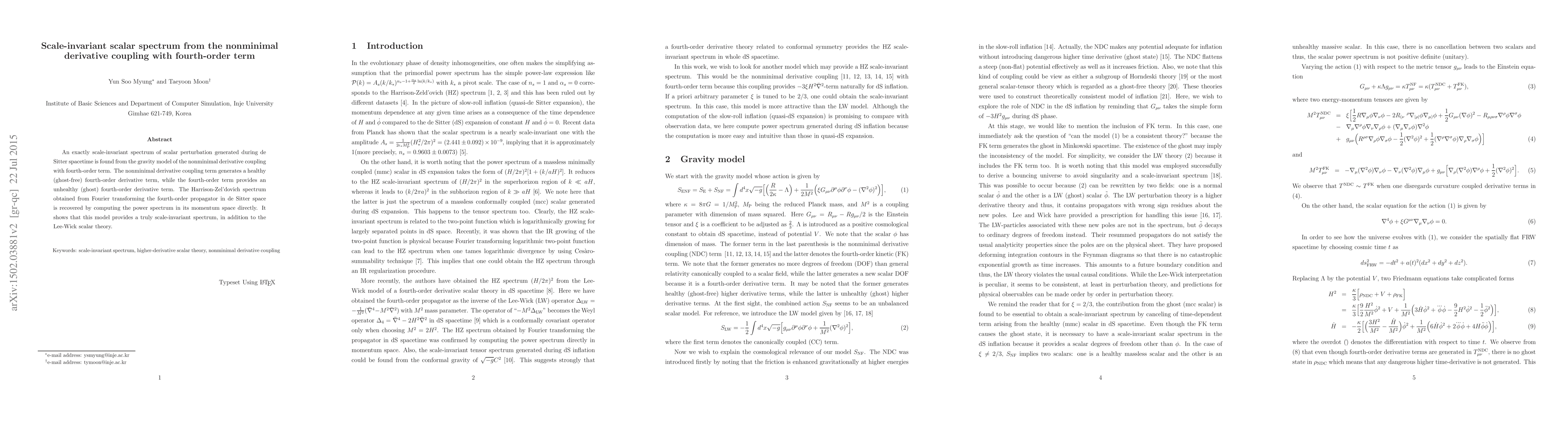 This paper demonstrates that a scale-invariant scalar spectrum can be generated in a gravity model with nonminimal derivative coupling and a fourth-order term, achieving a ghost-free fourth-order derivative while maintaining a healthy scalar perturbation. The resulting spectrum matches the Harrison-Zel'dovich spectrum, confirming the model's ability to produce a truly scale-invariant power spectrum.