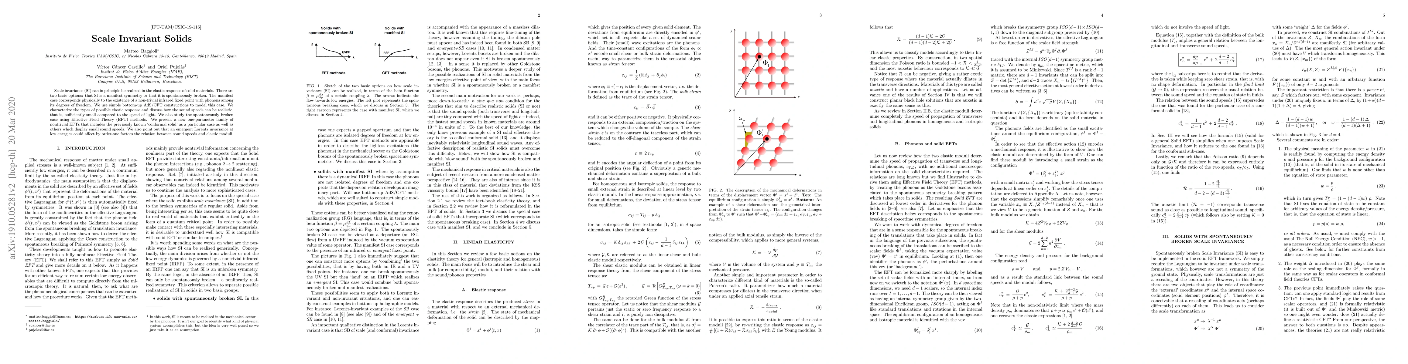 Scale invariance (SI) can in principle be realized in the elastic response of solid materials. There are two basic options: that SI is a manifest symmetry or that it is spontaneously broken. The manifest case corresponds physically to the existence of a non-trivial infrared fixed point with phonons among its degrees of freedom. We use simple bottom-up AdS/CFT constructions to model this case. We characterize the types of possible elastic response and discuss how the sound speeds can be realistic, that is, sufficiently small compared to the speed of light. We also study the spontaneously broken case using Effective Field Theory (EFT) methods. We present a new one-parameter family of nontrivial EFTs that includes the previously known `conformal solid' as a particular case as well as others which display small sound speeds. We also point out that an emergent Lorentz invariance at low energies could affect by order-one factors the relation between sound speeds and elastic moduli.