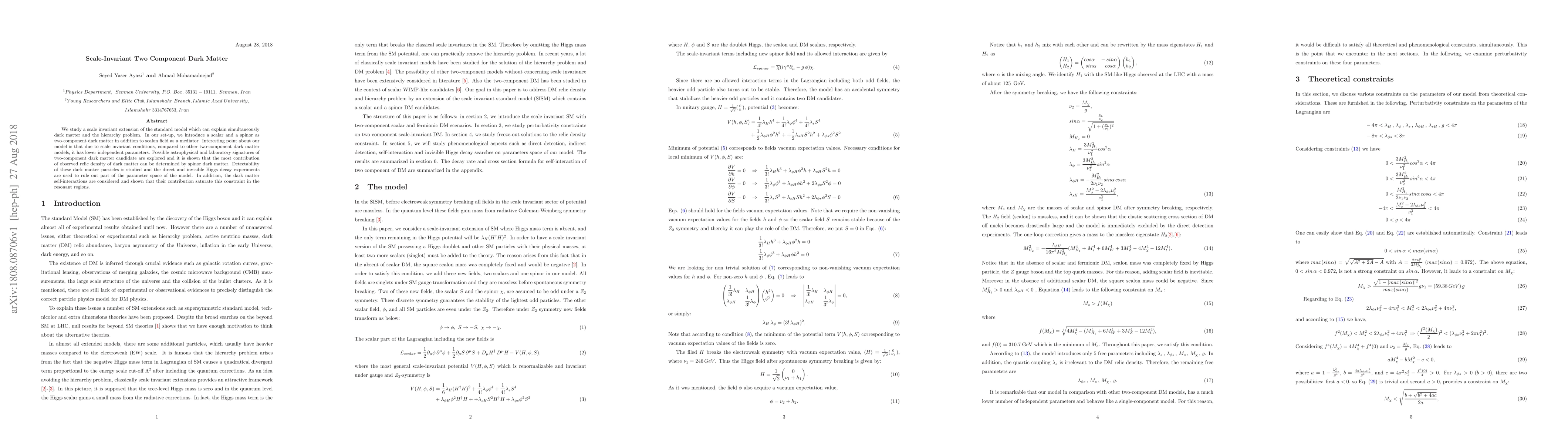This paper proposes a scale-invariant extension of the standard model featuring scalar and spinor components as dark matter, with a scalon field mediating interactions. The model's simplicity due to scale invariance reduces its independent parameters, and it is shown that spinor dark matter predominantly contributes to the observed relic density, while self-interactions and experimental constraints from Higgs decay help to rule out parts of the parameter space.