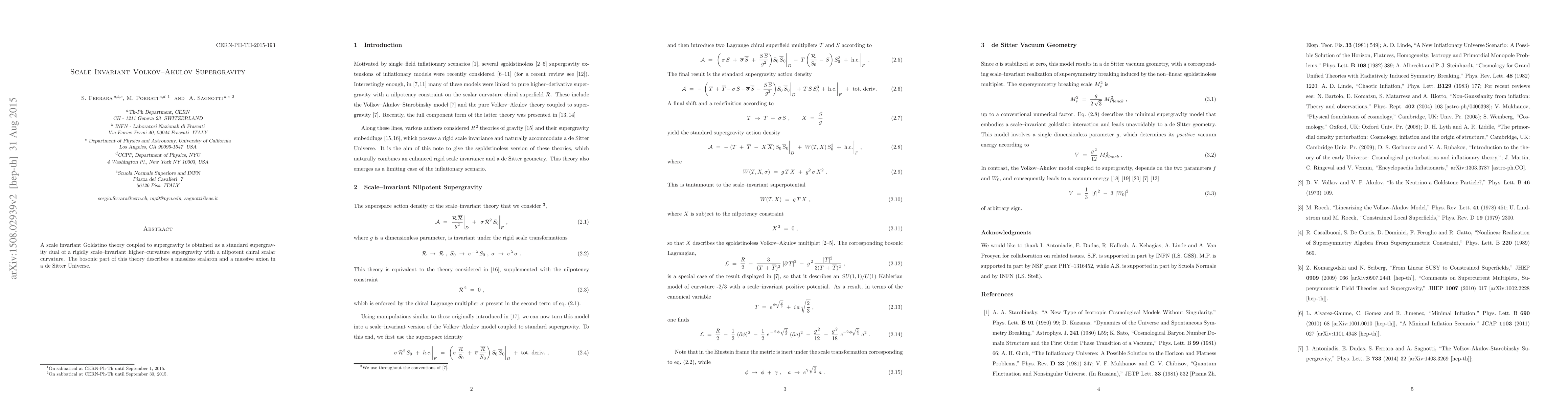 A scale invariant Goldstino theory coupled to Supergravity is obtained as a standard supergravity dual of a rigidly scale invariant higher--curvature Supergravity with a nilpotent chiral scalar curvature. The bosonic part of this theory describes a massless scalaron and a massive axion in a de Sitter Universe.