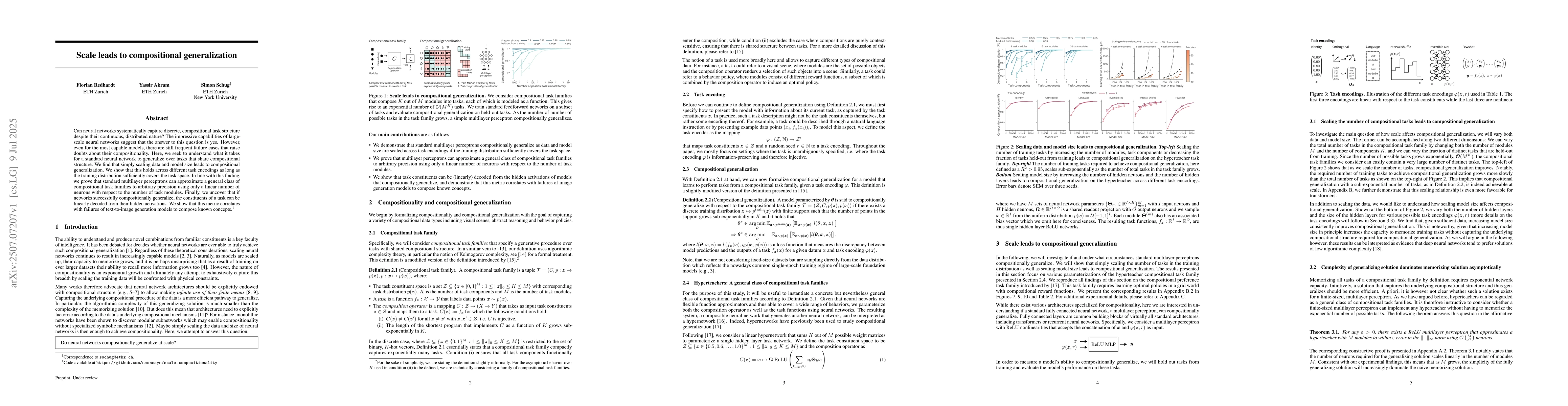 Can neural networks systematically capture discrete, compositional task structure despite their continuous, distributed nature? The impressive capabilities of large-scale neural networks suggest that the answer to this question is yes. However, even for the most capable models, there are still frequent failure cases that raise doubts about their compositionality. Here, we seek to understand what it takes for a standard neural network to generalize over tasks that share compositional structure. We find that simply scaling data and model size leads to compositional generalization. We show that this holds across different task encodings as long as the training distribution sufficiently covers the task space. In line with this finding, we prove that standard multilayer perceptrons can approximate a general class of compositional task families to arbitrary precision using only a linear number of neurons with respect to the number of task modules. Finally, we uncover that if networks successfully compositionally generalize, the constituents of a task can be linearly decoded from their hidden activations. We show that this metric correlates with failures of text-to-image generation models to compose known concepts.