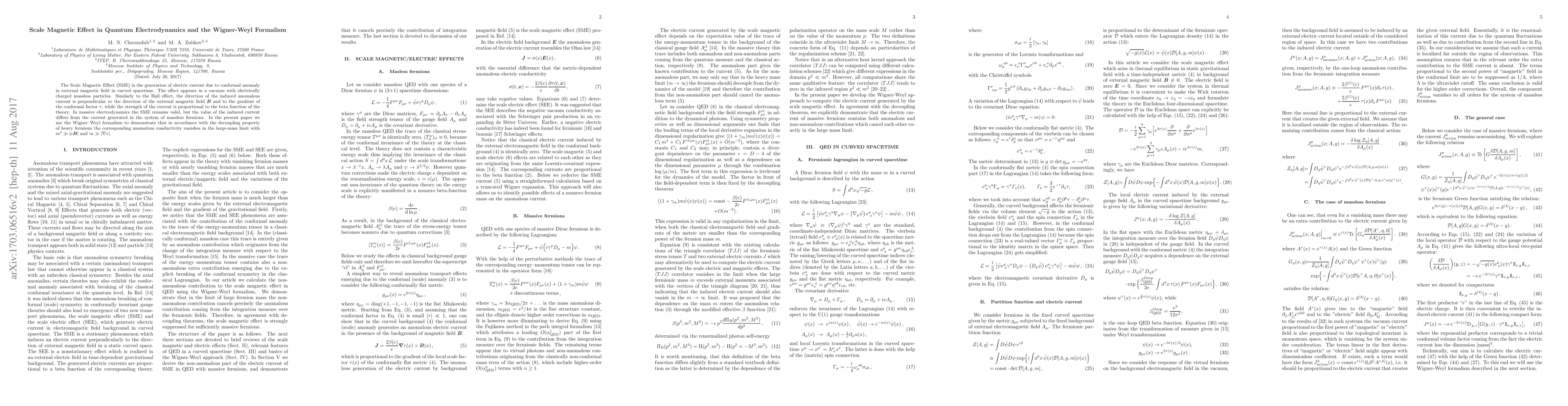 This paper investigates the Scale Magnetic Effect (SME) in quantum electrodynamics, demonstrating its generation of electric current due to conformal anomaly in curved spacetime. It employs the Wigner-Weyl formalism to show that the anomalous conductivity vanishes in the limit of large fermion masses, consistent with the decoupling property of heavy fermions.