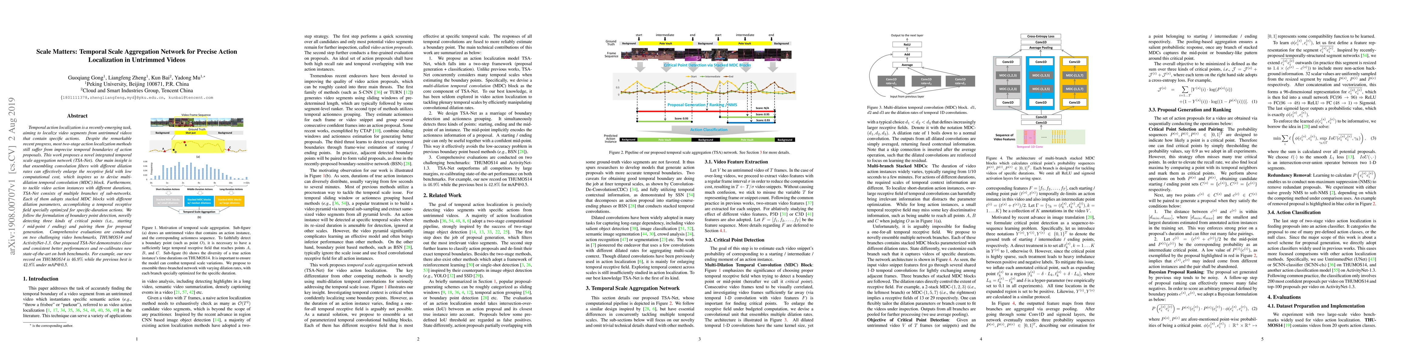 The paper proposes a Temporal Scale Aggregation Network (TSA-Net) to improve temporal action localization in untrimmed videos by employing multi-dilation temporal convolution blocks to optimize the temporal receptive field for actions of varying durations. TSA-Net achieves state-of-the-art performance on THUMOS14 and ActivityNet-1.3 benchmarks by detecting critical points for precise action proposal generation.
