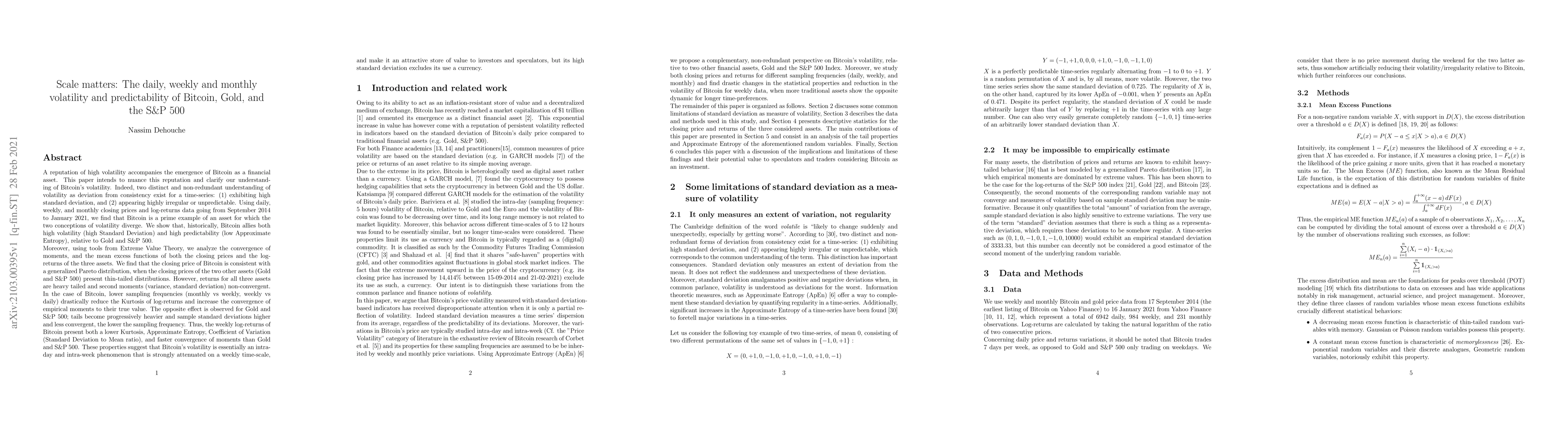This paper investigates Bitcoin's volatility and predictability compared to Gold and S&P 500 across different time scales, finding Bitcoin exhibits high volatility and predictability at daily and weekly scales but shows reduced volatility at monthly scales. The study reveals Bitcoin's closing prices follow a generalized Pareto distribution, while returns for all assets are heavy-tailed.