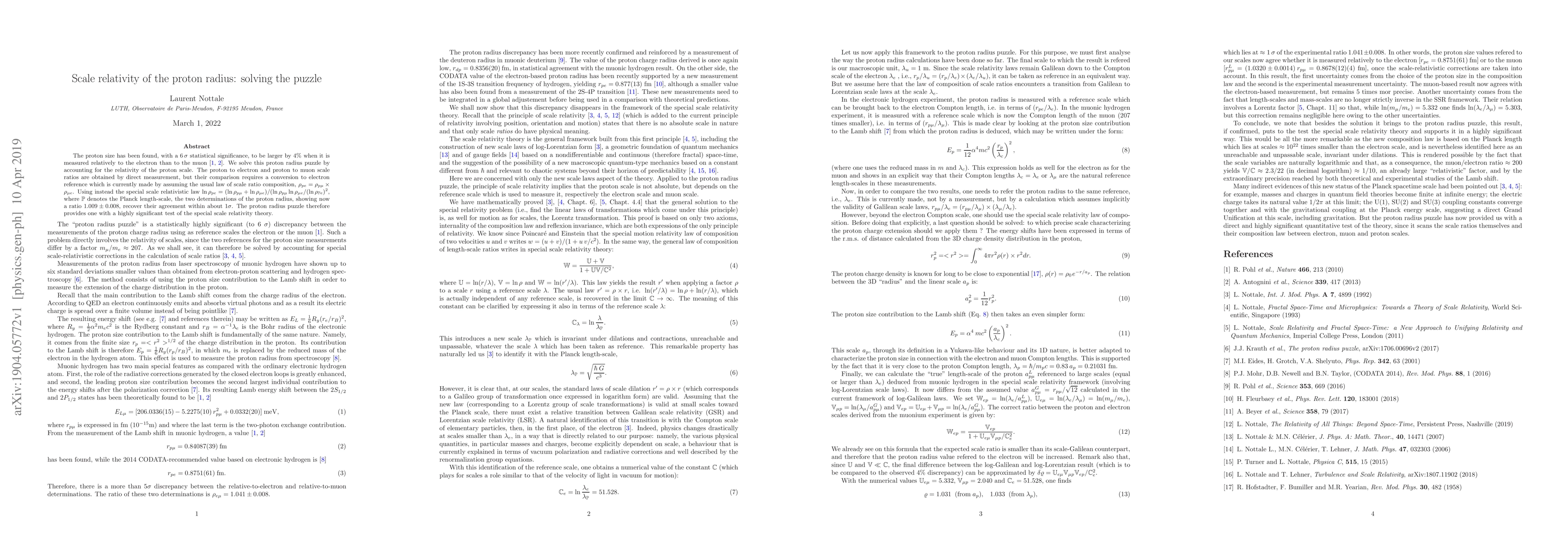 The proton size has been found, with a $6\,\sigma$ statistical significance, to be larger by 4% when it is measured relatively to the electron than to the muon [Pohl2010,Antognini2013]. We solve this proton radius puzzle by accounting for the relativity of the proton scale. The proton to electron and proton to muon scale ratios are obtained by direct measurement, but their comparison requires a conversion to electron reference which is currently made by assuming the usual law of scale ratio composition, $\rho_ {pe}=\rho_ {p\mu} \times \rho_ {\mu e}$. Using instead the special scale relativistic law $\ln \rho_ {pe}=(\ln\rho_ {p\mu}+\ln\rho_ {\mu e})/(\ln\rho_ {p\mu} \ln\rho_ {\mu e}/(\ln\rho_ {\mathbb{P} e})^2$, where $\mathbb{P}$ denotes the Planck length-scale, the two determinations of the proton radius, showing now a ratio $1.009 \pm 0.008$, recover their agreement within about $1\sigma$. The proton radius puzzle therefore provides one with a highly significant test of the special scale relativity theory.