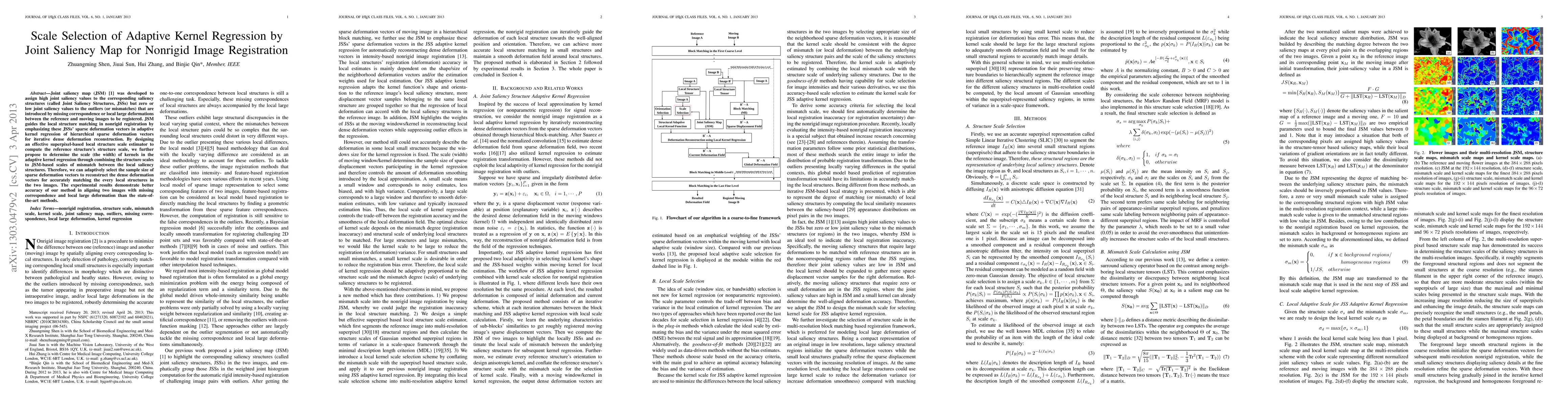 This paper proposes a method for nonrigid image registration using a joint saliency map (JSM) to identify salient structures and adaptive kernel regression to match local deformations. The scale of kernels is determined by combining structure scales and JSM-based scales, leading to improved accuracy in aligning images with missing correspondence and large deformations.