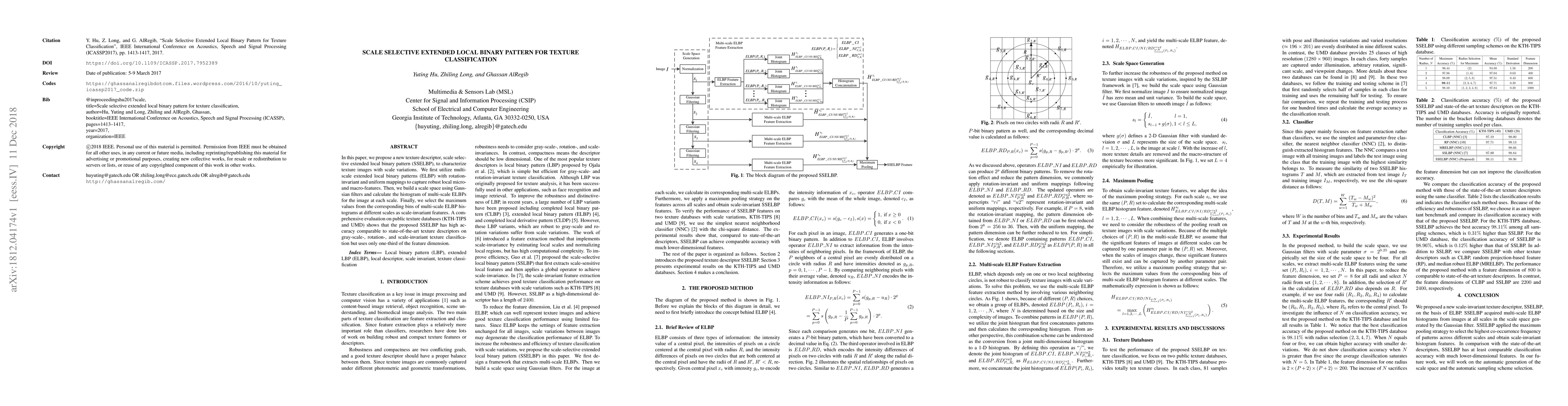 This paper introduces a scale selective extended local binary pattern (SSELBP) for robust texture classification, utilizing multi-scale ELBPs and Gaussian filters to capture invariant features, achieving high accuracy with reduced feature dimensions. Evaluations on KTH-TIPS and UMD databases demonstrate its effectiveness.