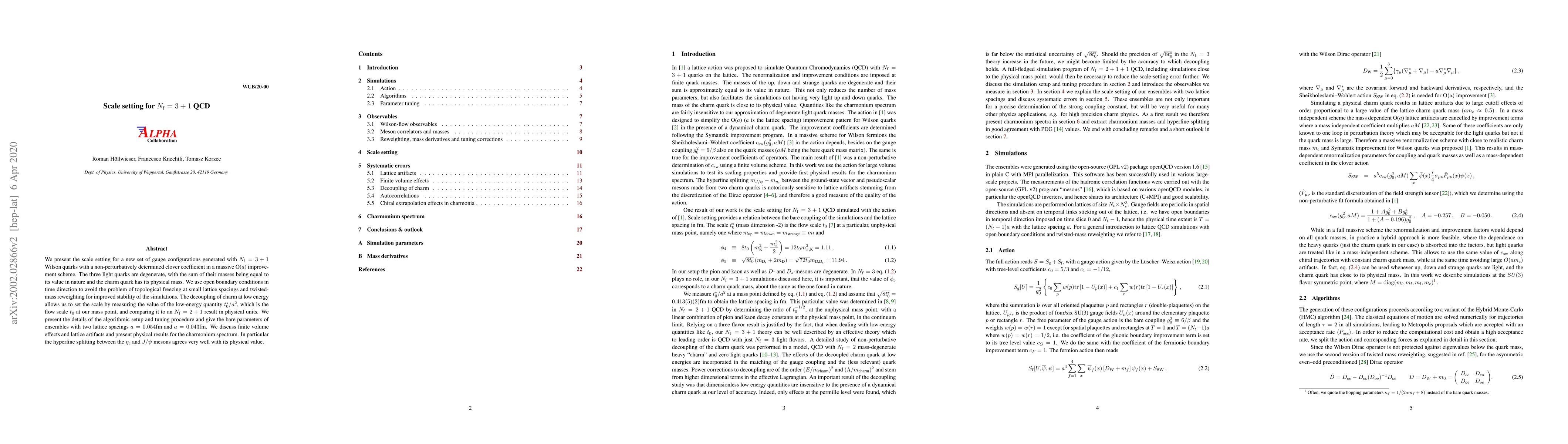 We present the scale setting for a new set of gauge configurations generated with $N_f=3+1$ Wilson quarks with a non-perturbatively determined clover coefficient in a massive O($a$) improvement scheme. The three light quarks are degenerate, with the sum of their masses being equal to its value in nature and the charm quark has its physical mass. We use open boundary conditions in time direction to avoid the problem of topological freezing at small lattice spacings and twisted-mass reweighting for improved stability of the simulations. The decoupling of charm at low energy allows us to set the scale by measuring the value of the low-energy quantity $t_0^\star/a^2$, which is the flow scale $t_0$ at our mass point, and comparing it to an $N_f=2+1$ result in physical units. We present the details of the algorithmic setup and tuning procedure and give the bare parameters of ensembles with two lattice spacings a=0.054 fm and a=0.043 fm. We discuss finite volume effects and lattice artifacts and present physical results for the charmonium spectrum. In particular the hyperfine splitting between the $\eta_c$ and $J/\psi$ mesons agrees very well with its physical value.