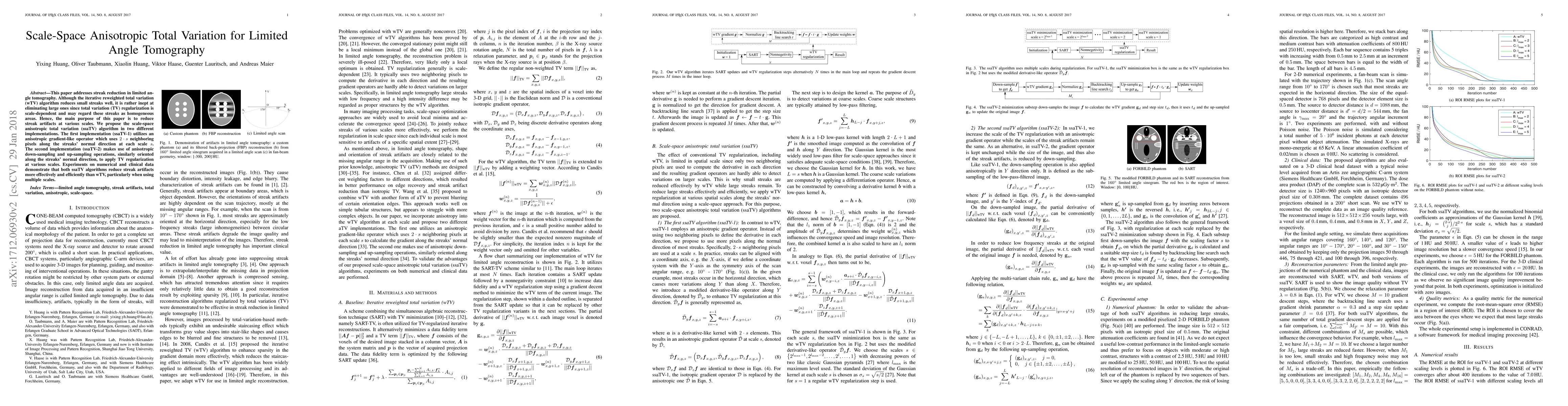 This paper proposes the scale-space anisotropic total variation (ssaTV) algorithm to reduce streak artifacts in limited angle tomography. Both ssaTV implementations outperform the iterative reweighted total variation (wTV) by effectively eliminating streaks at various scales, demonstrating superior efficiency and effectiveness in experiments.