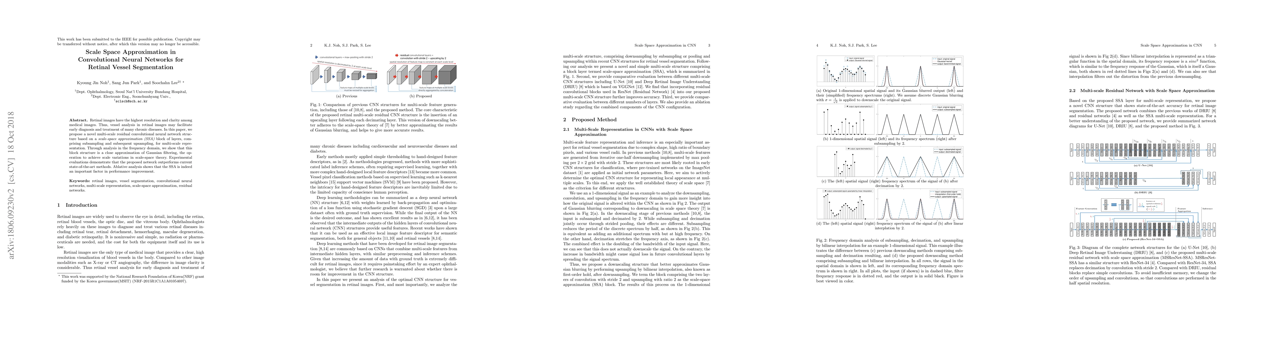 Retinal images have the highest resolution and clarity among medical images. Thus, vessel analysis in retinal images may facilitate early diagnosis and treatment of many chronic diseases. In this paper, we propose a novel multi-scale residual convolutional neural network structure based on a \emph{scale-space approximation (SSA)} block of layers, comprising subsampling and subsequent upsampling, for multi-scale representation. Through analysis in the frequency domain, we show that this block structure is a close approximation of Gaussian filtering, the operation to achieve scale variations in scale-space theory. Experimental evaluations demonstrate that the proposed network outperforms current state-of-the-art methods. Ablative analysis shows that the SSA is indeed an important factor in performance improvement.