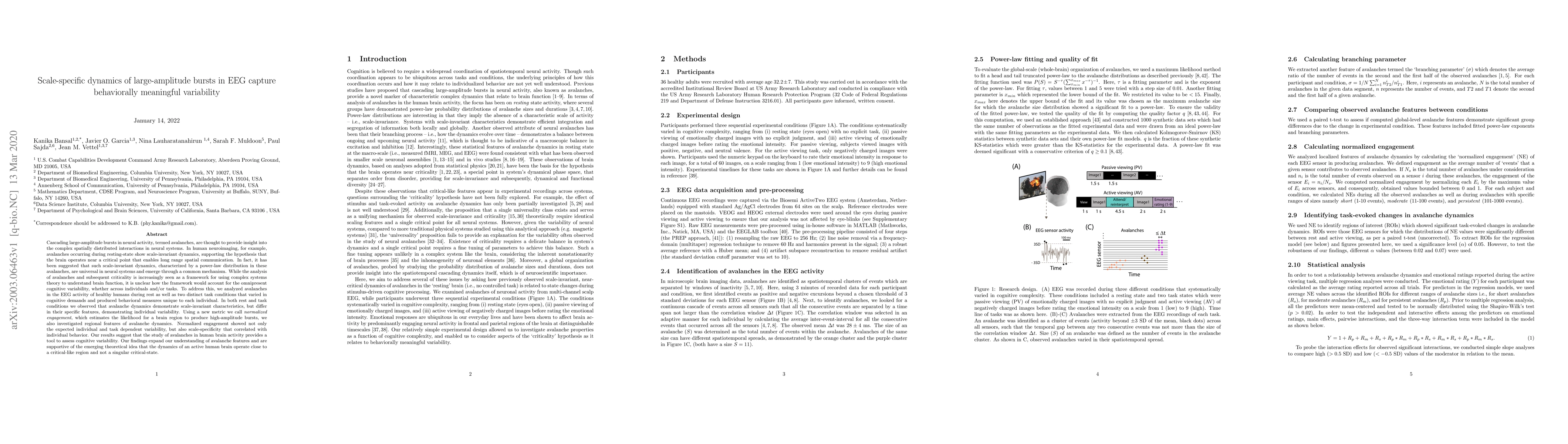 Cascading large-amplitude bursts in neural activity, termed avalanches, are thought to provide insight into the complex spatially distributed interactions in neural systems. In human neuroimaging, for example, avalanches occurring during resting-state show scale-invariant dynamics, supporting the hypothesis that the brain operates near a critical point that enables long range spatial communication. In fact, it has been suggested that such scale-invariant dynamics, characterized by a power-law distribution in these avalanches, are universal in neural systems and emerge through a common mechanism. While the analysis of avalanches and subsequent criticality is increasingly seen as a framework for using complex systems theory to understand brain function, it is unclear how the framework would account for the omnipresent cognitive variability, whether across individuals and/or tasks. To address this, we analyzed avalanches in the EEG activity of healthy humans during rest as well as two distinct task conditions that varied in cognitive demands and produced behavioral measures unique to each individual. In both rest and task conditions we observed that avalanche dynamics demonstrate scale-invariant characteristics, but differ in their specific features, demonstrating individual variability. Using a new metric we call normalized engagement, which estimates the likelihood for a brain region to produce high-amplitude bursts, we also investigated regional features of avalanche dynamics. Normalized engagement showed not only the expected individual and task dependent variability, but also scale-specificity that correlated with individual behavior. Our findings expand our understanding of avalanche features and are supportive of the emerging theoretical idea that the dynamics of an active human brain operate close to a critical-like region and not a singular critical-state.