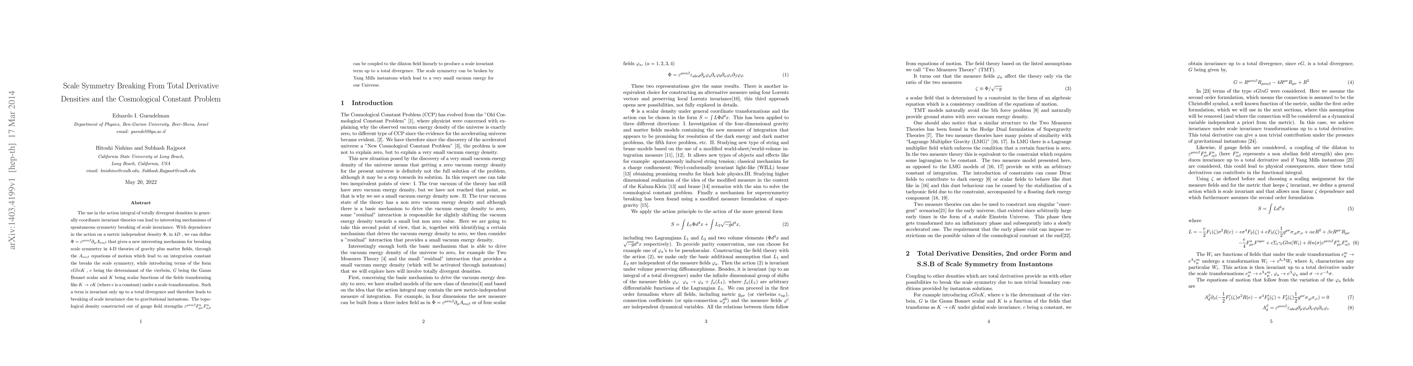 The use in the action integral of totally divergent densities in generally coordinate invariant theories can lead to interesting mechanisms of spontaneous symmetry breaking of scale invariance. With dependence in the action on a metric independent density $\Phi$, in $4D$ , we can define $\Phi =\varepsilon^{\mu\nu\alpha\beta}\partial_{\mu}A_{\nu\alpha\beta}$ that gives a new interesting mechanism for breaking scale symmetry in 4-D theories of gravity plus matter fields, through the $A_{\nu\alpha\beta}$ equations of motion which lead to an integration constant the breaks the scale symmetry, while introducing terms of the form $eG ln K$ , $e$ being the determinant of the vierbein, $G$ being the Gauss Bonnet scalar and $K$ being scalar functions of the fields transforming like $K \rightarrow cK $ (where c is a constant) under a scale transformation. Such a term is invariant only up to a total divergence and therefore leads to breaking of scale invariance due to gravitational instantons. The topological density constructed out of gauge field strengths $\varepsilon^{\mu\nu\alpha\beta}F^a_{\mu\nu}F^a_{\alpha\beta}$ can be coupled to the dilaton field linearly to produce a scale invariant term up to a total divergence. The scale symmetry can be broken by Yang Mills instantons which lead to a very small vacuum energy for our Universe.