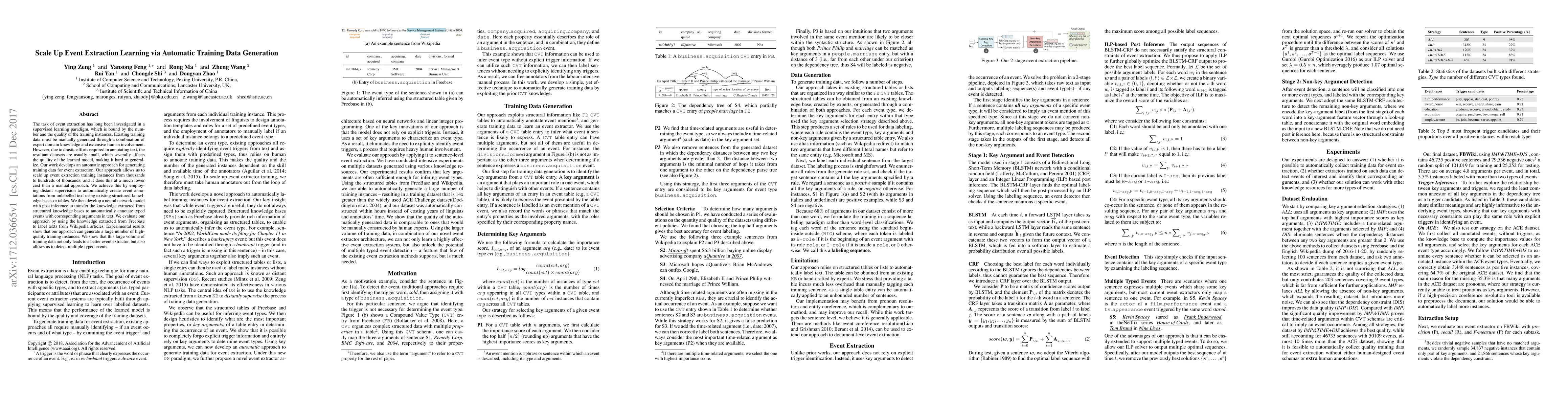 This paper proposes an automatic method to generate large-scale training data for event extraction using distant supervision and neural networks, significantly reducing annotation costs and improving model performance and generalization. The approach leverages structured knowledge bases to label events in unlabelled text, demonstrating its effectiveness through experiments on Wikipedia articles.