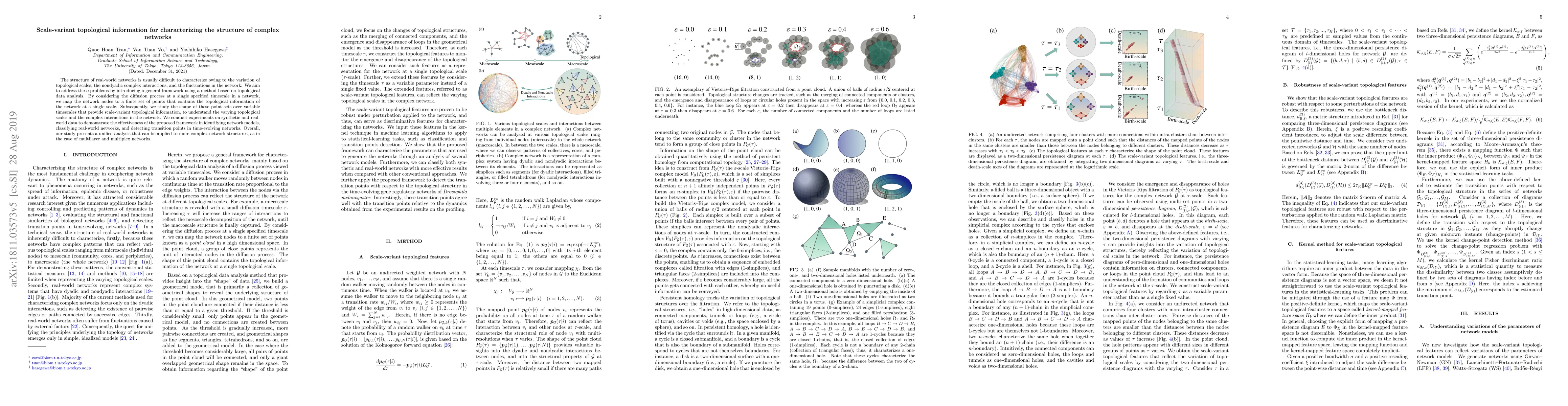 The structure of real-world networks is usually difficult to characterize owing to the variation of topological scales, the nondyadic complex interactions, and the fluctuations in the network. We aim to address these problems by introducing a general framework using a method based on topological data analysis. By considering the diffusion process at a single specified timescale in a network, we map the network nodes to a finite set of points that contains the topological information of the network at a single scale. Subsequently, we study the shape of these point sets over variable timescales that provide scale-variant topological information, to understand the varying topological scales and the complex interactions in the network. We conduct experiments on synthetic and real-world data to demonstrate the effectiveness of the proposed framework in identifying network models, classifying real-world networks, and detecting transition points in time-evolving networks. Overall, our study presents a unified analysis that can be applied to more complex network structures, as in the case of multilayer and multiplex networks.