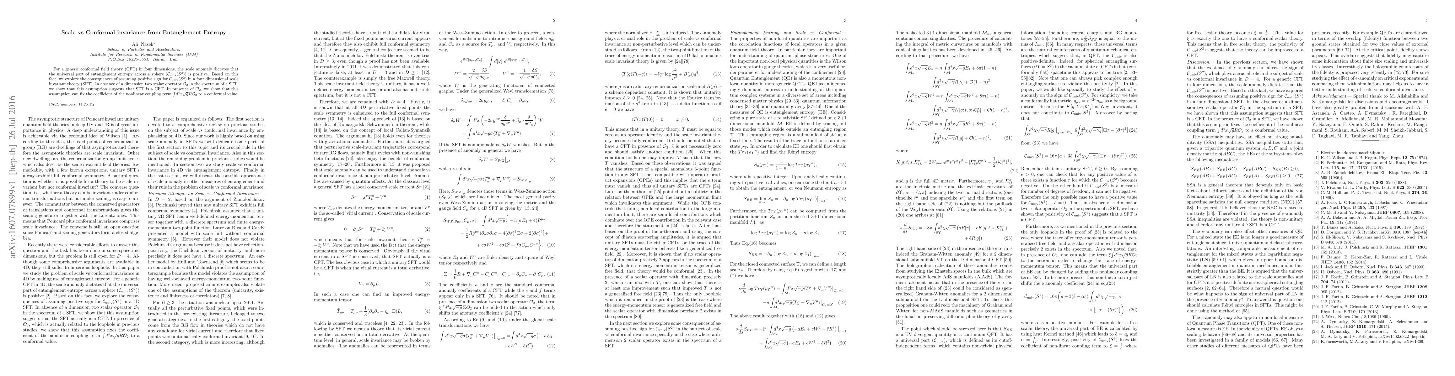 This paper investigates the implications of a positive universal entanglement entropy term for a sphere in four-dimensional scale invariant theories. It concludes that without a dimension two scalar operator, the theory behaves as a conformal field theory, while the presence of such an operator fixes the coefficient of a nonlinear coupling term to a conformal value.