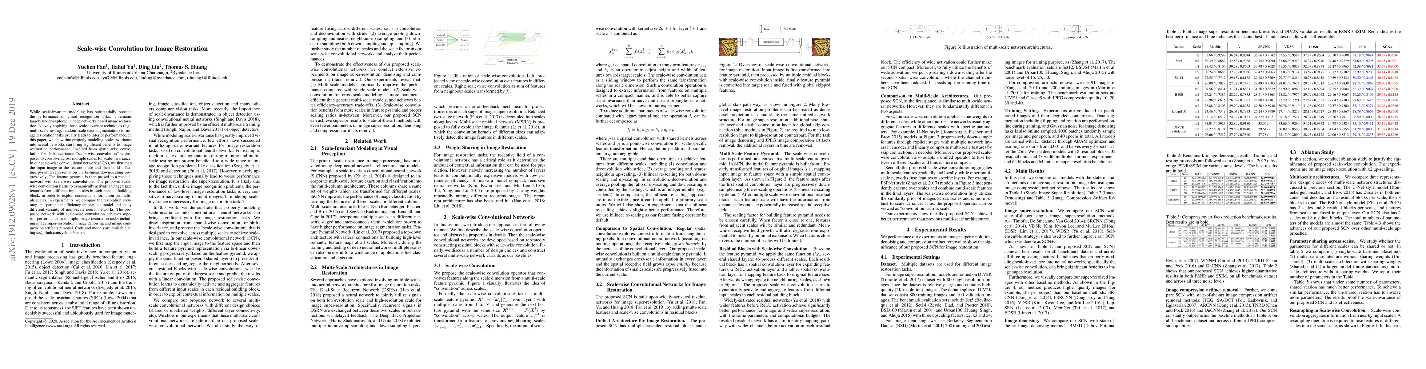 This paper proposes "scale-wise convolution" to enhance image restoration performance by dynamically aggregating features across multiple scales. The scale-wise convolutional network (SCN) builds a feature pyramid and uses residual blocks with scale-wise convolutions to exploit contextual information, achieving superior results in tasks like super-resolution, denoising, and artifact removal.