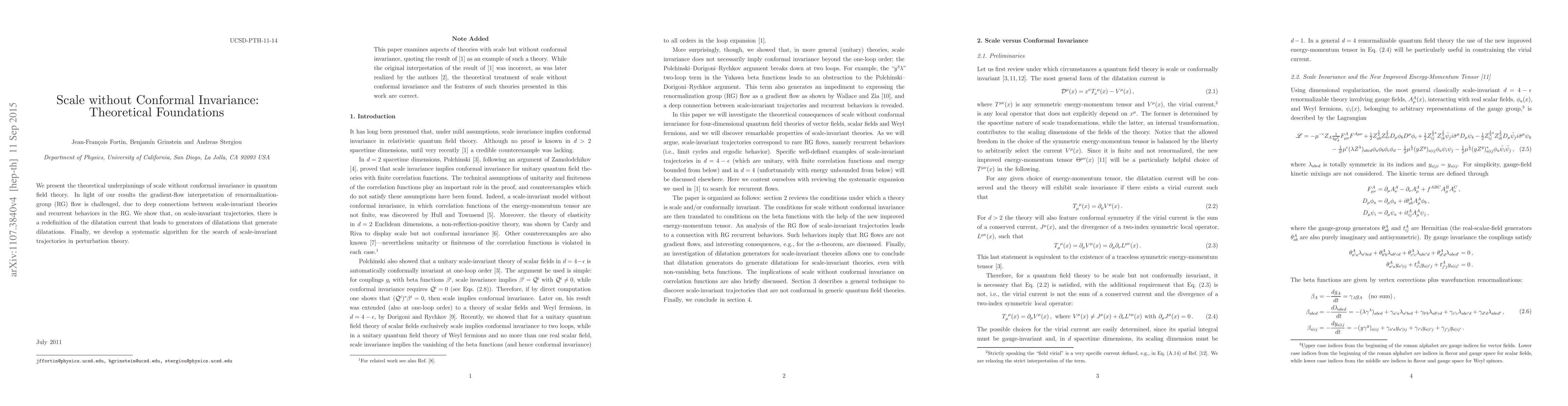 This paper explores the theoretical basis for scale invariance without conformal invariance in quantum field theory, challenging the gradient-flow interpretation of renormalization-group flow. It introduces a redefinition of the dilatation current on scale-invariant trajectories and proposes a systematic algorithm for identifying such trajectories in perturbation theory.