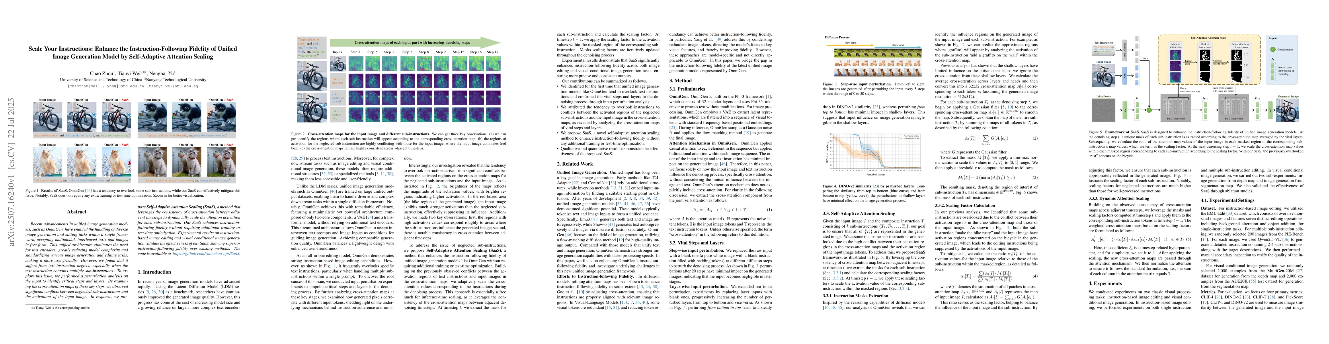 Recent advancements in unified image generation models, such as OmniGen, have enabled the handling of diverse image generation and editing tasks within a single framework, accepting multimodal, interleaved texts and images in free form. This unified architecture eliminates the need for text encoders, greatly reducing model complexity and standardizing various image generation and editing tasks, making it more user-friendly. However, we found that it suffers from text instruction neglect, especially when the text instruction contains multiple sub-instructions. To explore this issue, we performed a perturbation analysis on the input to identify critical steps and layers. By examining the cross-attention maps of these key steps, we observed significant conflicts between neglected sub-instructions and the activations of the input image. In response, we propose Self-Adaptive Attention Scaling (SaaS), a method that leverages the consistency of cross-attention between adjacent timesteps to dynamically scale the attention activation for each sub-instruction. Our SaaS enhances instruction-following fidelity without requiring additional training or test-time optimization. Experimental results on instruction-based image editing and visual conditional image generation validate the effectiveness of our SaaS, showing superior instruction-following fidelity over existing methods. The code is available https://github.com/zhouchao-ops/SaaS.