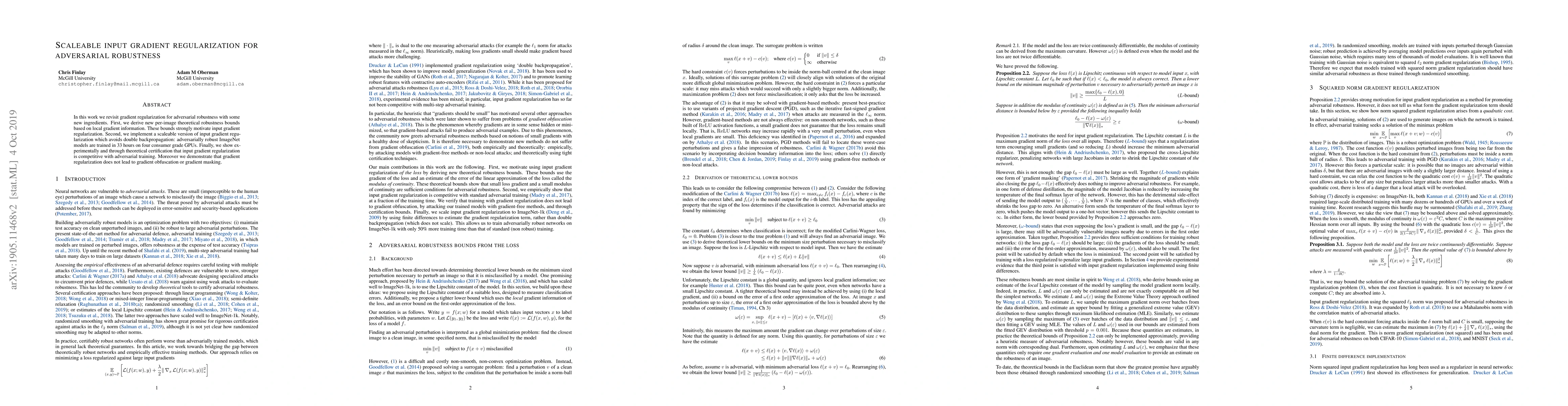 In this work we revisit gradient regularization for adversarial robustness with some new ingredients. First, we derive new per-image theoretical robustness bounds based on local gradient information. These bounds strongly motivate input gradient regularization. Second, we implement a scaleable version of input gradient regularization which avoids double backpropagation: adversarially robust ImageNet models are trained in 33 hours on four consumer grade GPUs. Finally, we show experimentally and through theoretical certification that input gradient regularization is competitive with adversarial training. Moreover we demonstrate that gradient regularization does not lead to gradient obfuscation or gradient masking.