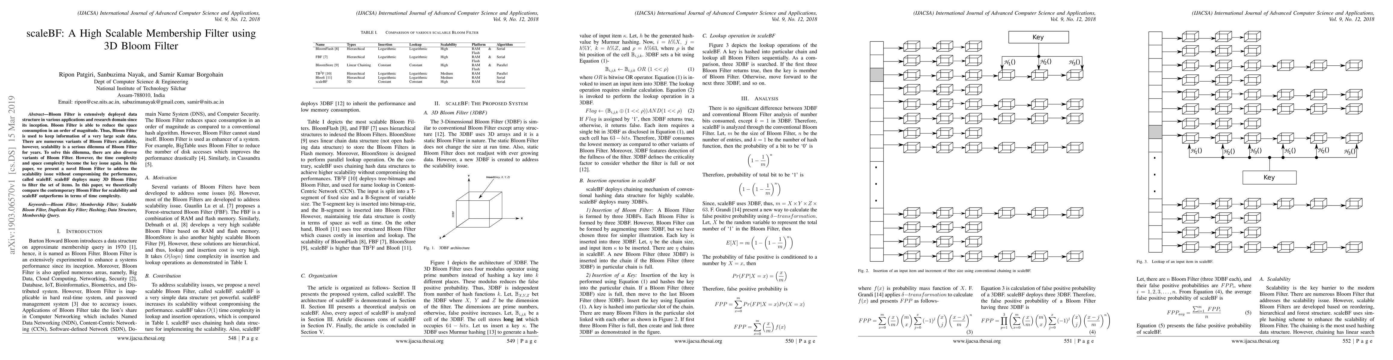 Title: scaleBF: A High Scalable Membership Filter using 3D Bloom Filter Summary: This paper introduces scaleBF, a novel scalable Bloom Filter utilizing multiple 3D Bloom Filters to enhance performance and address scalability issues, demonstrating superior time complexity compared to traditional Bloom Filters.