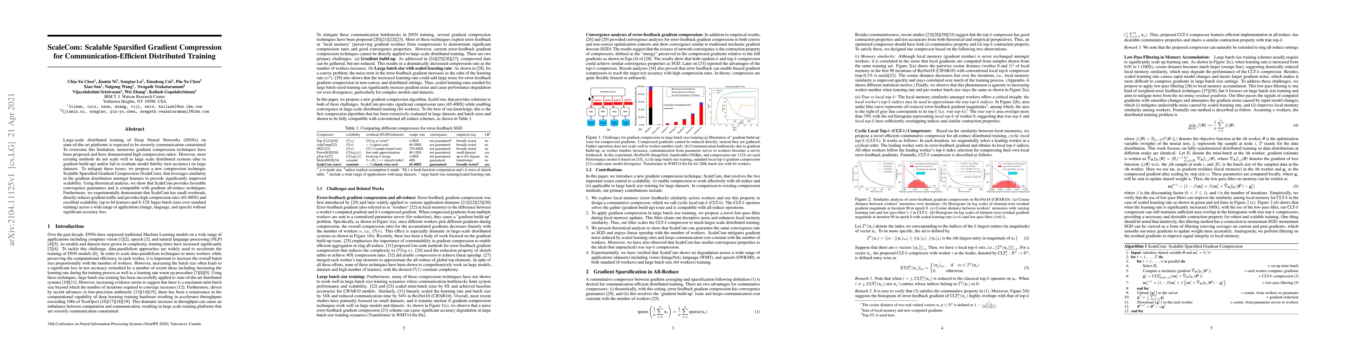 ScaleCom introduces a scalable gradient compression technique for communication-efficient distributed training of DNNs, achieving high compression ratios and excellent scalability without significant accuracy loss. It leverages gradient distribution similarity and provides favorable convergence guarantees, demonstrating high compression rates and scalability across various applications.