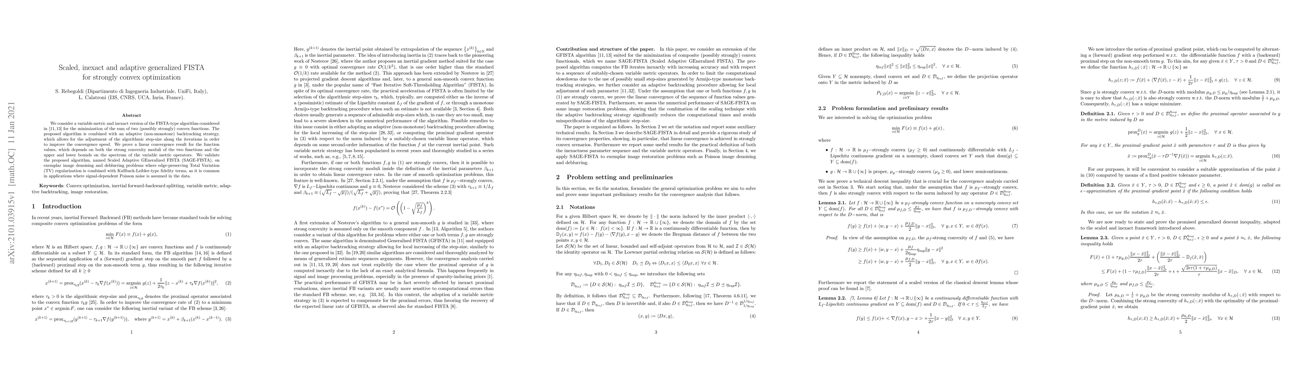 This paper proposes a scaled, inexact, and adaptive version of the FISTA algorithm, named SAGE-FISTA, for minimizing the sum of strongly convex functions. The algorithm incorporates an adaptive backtracking strategy to adjust step-sizes, achieving linear convergence dependent on function convexity and metric operator spectrum bounds. The method is validated on image denoising and deblurring tasks using edge-preserving regularization.