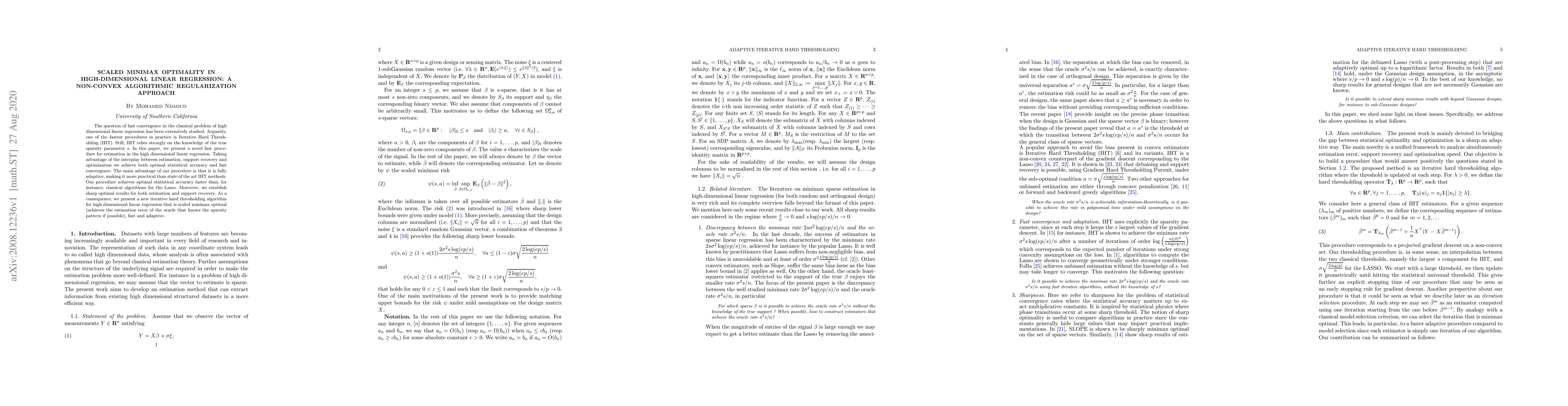 This paper introduces a novel adaptive iterative hard thresholding algorithm for high-dimensional linear regression that achieves optimal statistical accuracy and fast convergence without requiring prior knowledge of the true sparsity parameter. The proposed method outperforms classical Lasso algorithms and is scaled minimax optimal.
