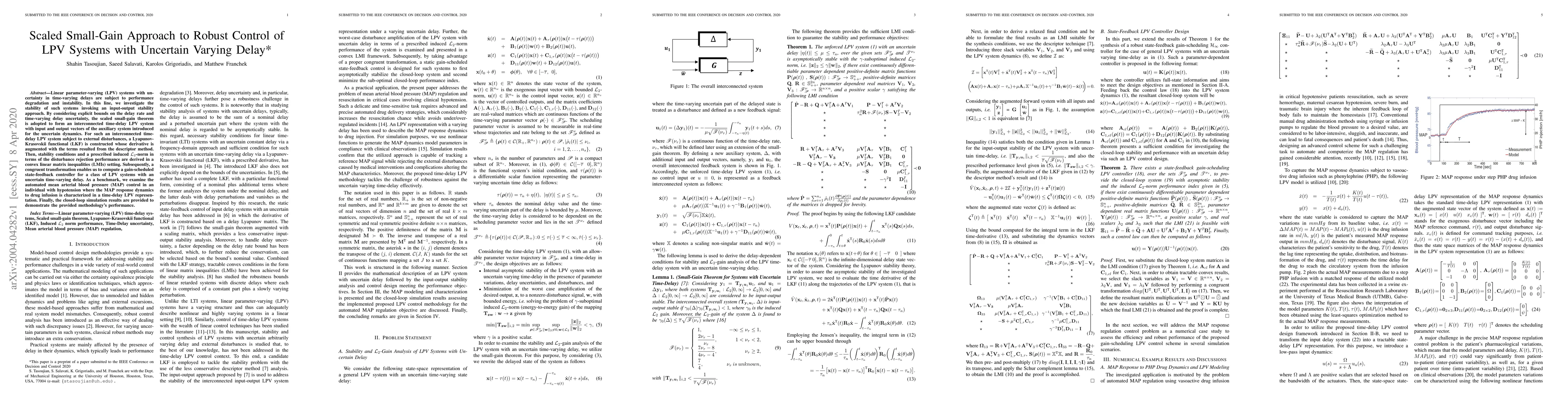 This paper explores the stability and control of LPV systems with uncertain time-varying delays using a scaled small-gain approach. It derives stability conditions and disturbance rejection performance in a convex LMI framework, and applies the methodology to automated mean arterial blood pressure control.