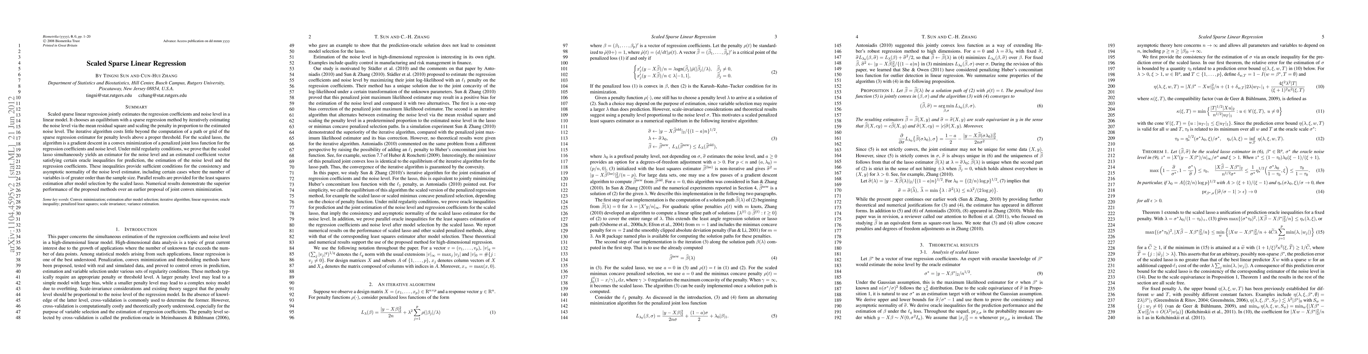The paper proposes scaled sparse linear regression, which iteratively estimates noise level and regression coefficients, achieving sparsity and consistency even when the number of variables exceeds the sample size. The method outperforms previous joint convex minimization techniques, as demonstrated by numerical results.