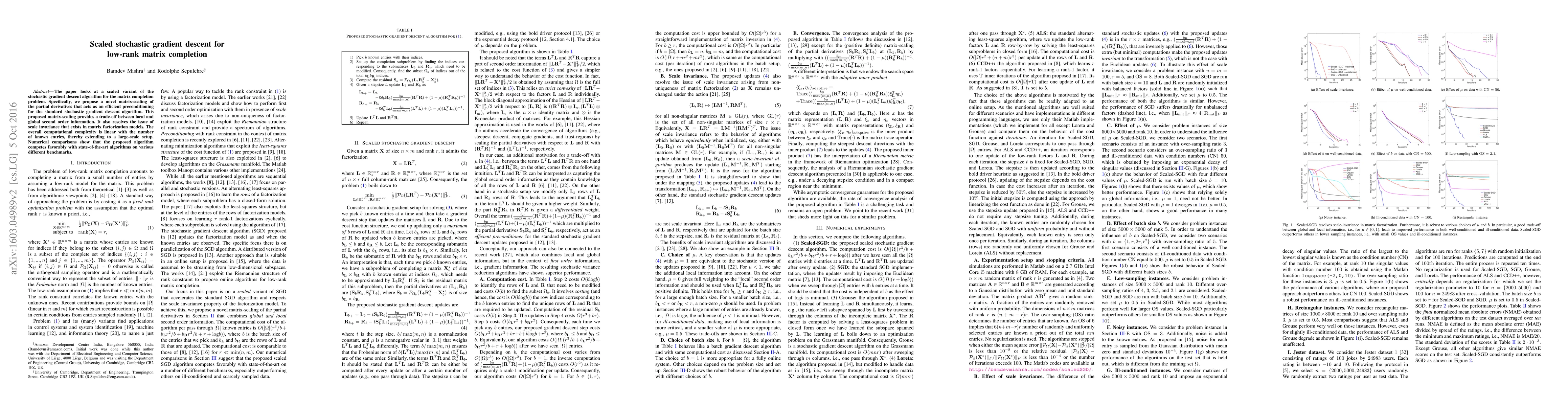 The paper proposes a scaled stochastic gradient descent algorithm for low-rank matrix completion, introducing a novel matrix-scaling of partial derivatives to efficiently precondition the standard algorithm. This approach resolves scale invariance issues and offers competitive performance on large-scale benchmarks.