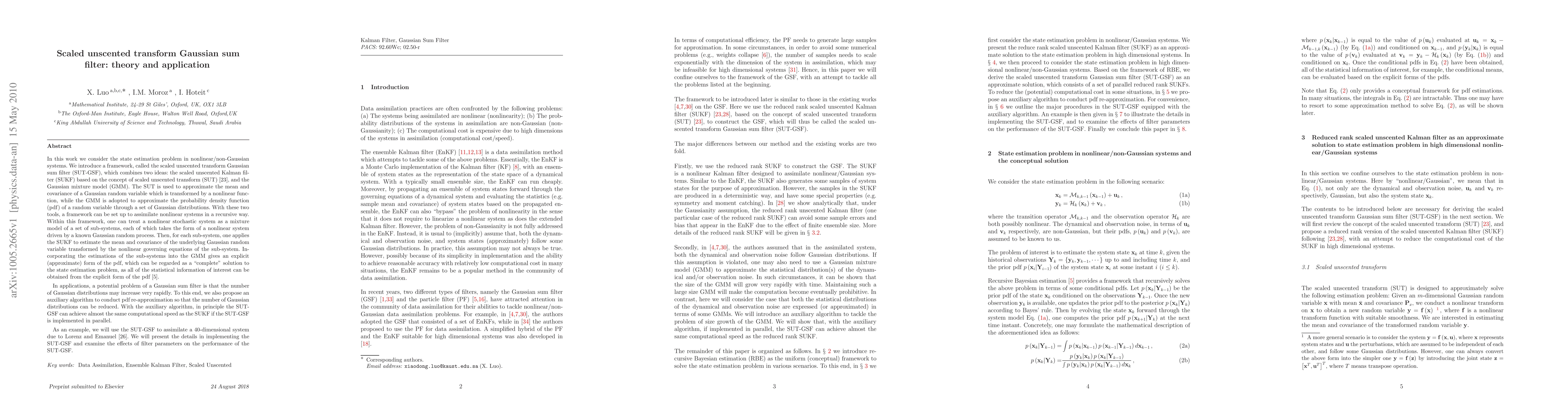 In this work we consider the state estimation problem in nonlinear/non-Gaussian systems. We introduce a framework, called the scaled unscented transform Gaussian sum filter (SUT-GSF), which combines two ideas: the scaled unscented Kalman filter (SUKF) based on the concept of scaled unscented transform (SUT), and the Gaussian mixture model (GMM). The SUT is used to approximate the mean and covariance of a Gaussian random variable which is transformed by a nonlinear function, while the GMM is adopted to approximate the probability density function (pdf) of a random variable through a set of Gaussian distributions. With these two tools, a framework can be set up to assimilate nonlinear systems in a recursive way. Within this framework, one can treat a nonlinear stochastic system as a mixture model of a set of sub-systems, each of which takes the form of a nonlinear system driven by a known Gaussian random process. Then, for each sub-system, one applies the SUKF to estimate the mean and covariance of the underlying Gaussian random variable transformed by the nonlinear governing equations of the sub-system. Incorporating the estimations of the sub-systems into the GMM gives an explicit (approximate) form of the pdf, which can be regarded as a "complete" solution to the state estimation problem, as all of the statistical information of interest can be obtained from the explicit form of the pdf ... This work is on the construction of the Gaussian sum filter based on the scaled unscented transform.
