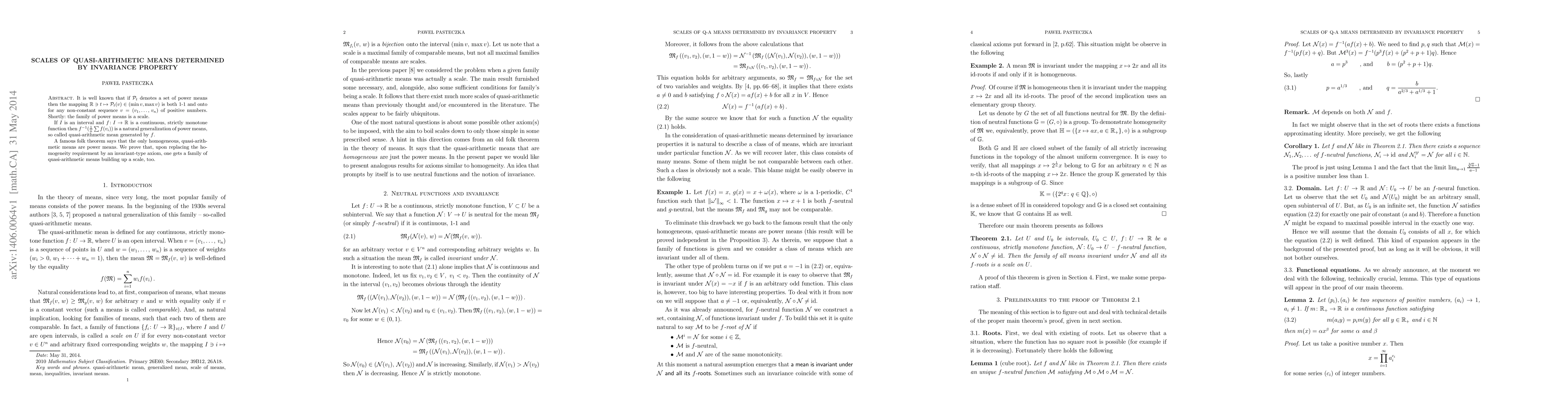 This paper explores quasi-arithmetic means generated by continuous, strictly monotone functions, proving that replacing homogeneity with an invariance property yields a family of quasi-arithmetic means that form a scale, akin to the family of power means.