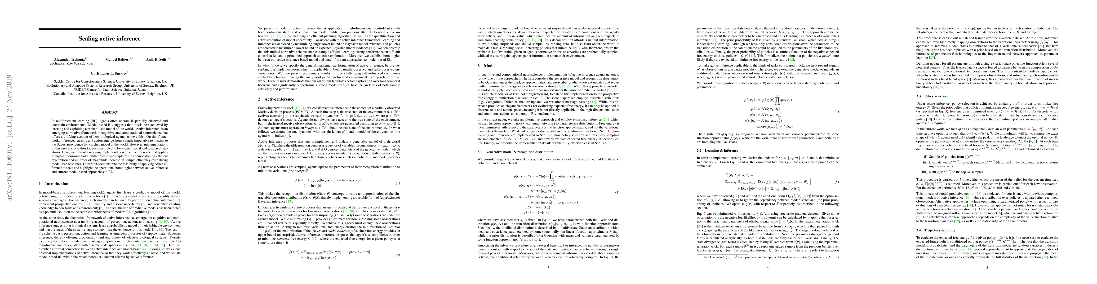 In reinforcement learning (RL), agents often operate in partially observed and uncertain environments. Model-based RL suggests that this is best achieved by learning and exploiting a probabilistic model of the world. 'Active inference' is an emerging normative framework in cognitive and computational neuroscience that offers a unifying account of how biological agents achieve this. On this framework, inference, learning and action emerge from a single imperative to maximize the Bayesian evidence for a niched model of the world. However, implementations of this process have thus far been restricted to low-dimensional and idealized situations. Here, we present a working implementation of active inference that applies to high-dimensional tasks, with proof-of-principle results demonstrating efficient exploration and an order of magnitude increase in sample efficiency over strong model-free baselines. Our results demonstrate the feasibility of applying active inference at scale and highlight the operational homologies between active inference and current model-based approaches to RL.