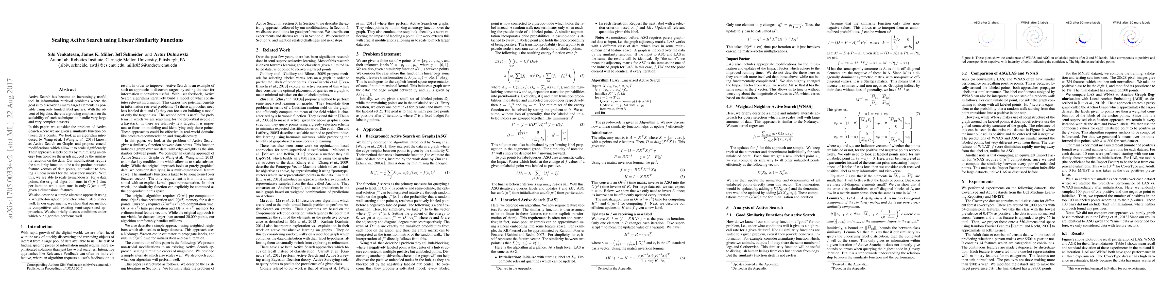 This paper proposes modifications to an Active Search algorithm for large datasets, improving scalability by requiring linear similarity functions. The modified algorithm significantly reduces runtime complexity from $O(n^2)$ to $O(nr + r^2)$ for $r$-dimensional features, and an alternative weighted-neighbor predictor is also presented, demonstrating competitive performance with existing semi-supervised methods.
