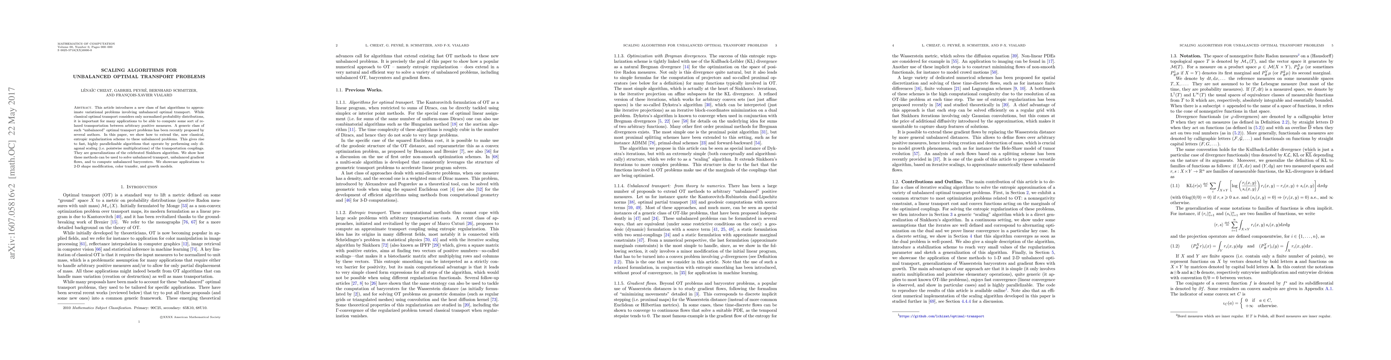 This paper presents fast, scalable algorithms for solving unbalanced optimal transport problems using entropic regularization, extending the Sinkhorn algorithm through diagonal scaling. These methods are applied to various applications including 2-D shape modification, color transfer, and growth models.