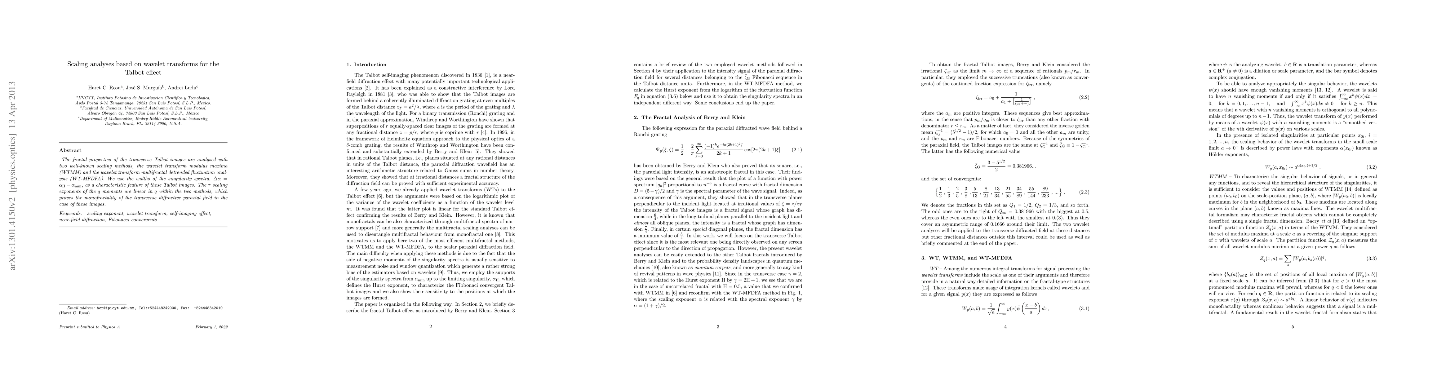 This paper analyzes the fractal properties of transverse Talbot images using wavelet transform modulus maxima and wavelet transform multifractal detrended fluctuation analysis. The study shows that the tau scaling exponents are linear in q, confirming the monofractality of the diffractive paraxial field in these images.