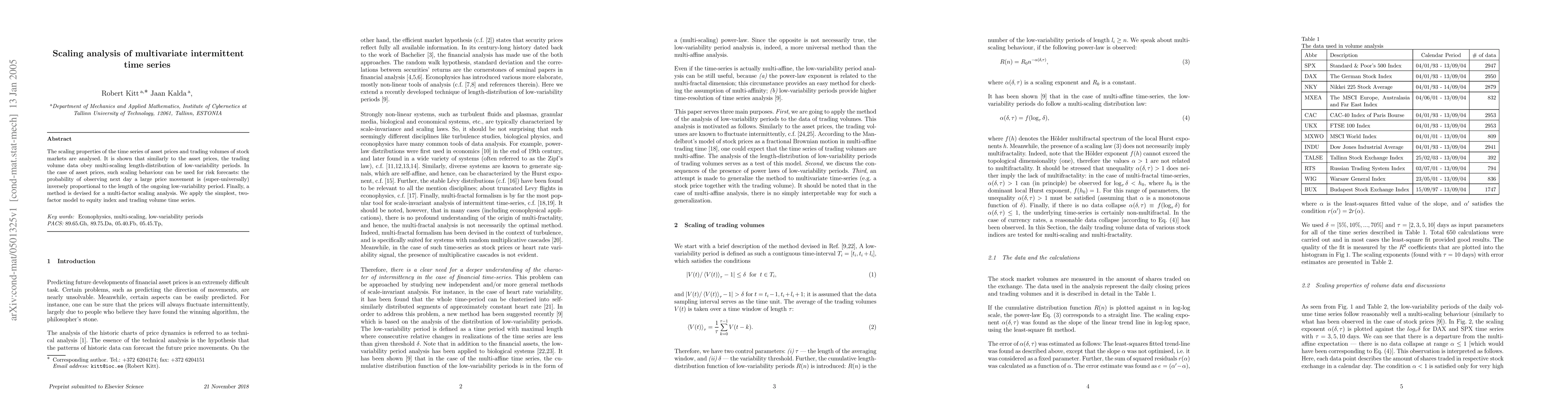 The scaling properties of the time series of asset prices and trading volumes of stock markets are analysed. It is shown that similarly to the asset prices, the trading volume data obey multi-scaling length-distribution of low-variability periods. In the case of asset prices, such scaling behaviour can be used for risk forecasts: the probability of observing next day a large price movement is (super-universally) inversely proportional to the length of the ongoing low-variability period. Finally, a method is devised for a multi-factor scaling analysis. We apply the simplest, two-factor model to equity index and trading volume time series.