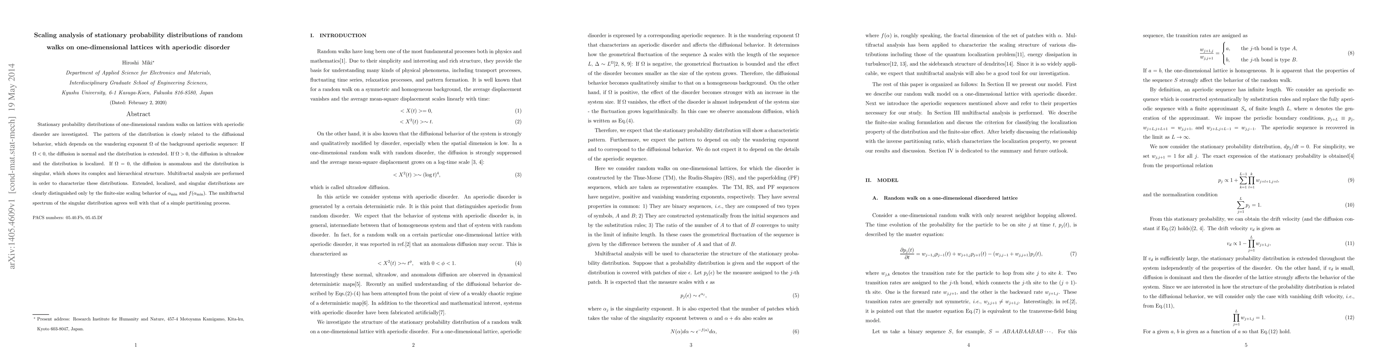 Stationary probability distributions of one-dimensional random walks on lattices with aperiodic disorder are investigated. The pattern of the distribution is closely related to the diffusional behavior, which depends on the wandering exponent $\Omega$ of the background aperiodic sequence: If $\Omega<0$, the diffusion is normal and the distribution is extended. If $\Omega>0$, the diffusion is ultraslow and the distribution is localized. If $\Omega=0$, the diffusion is anomalous and the distribution is singular, which shows its complex and hierarchical structure. Multifractal analysis are performed in order to characterize these distributions. Extended, localized, and singular distributions are clearly distinguished only by the finite-size scaling behavior of $\alpha_{\rm min}$ and $f(\alpha_{\rm min})$. The multifractal spectrum of the singular distribution agrees well with that of a simple partitioning process.