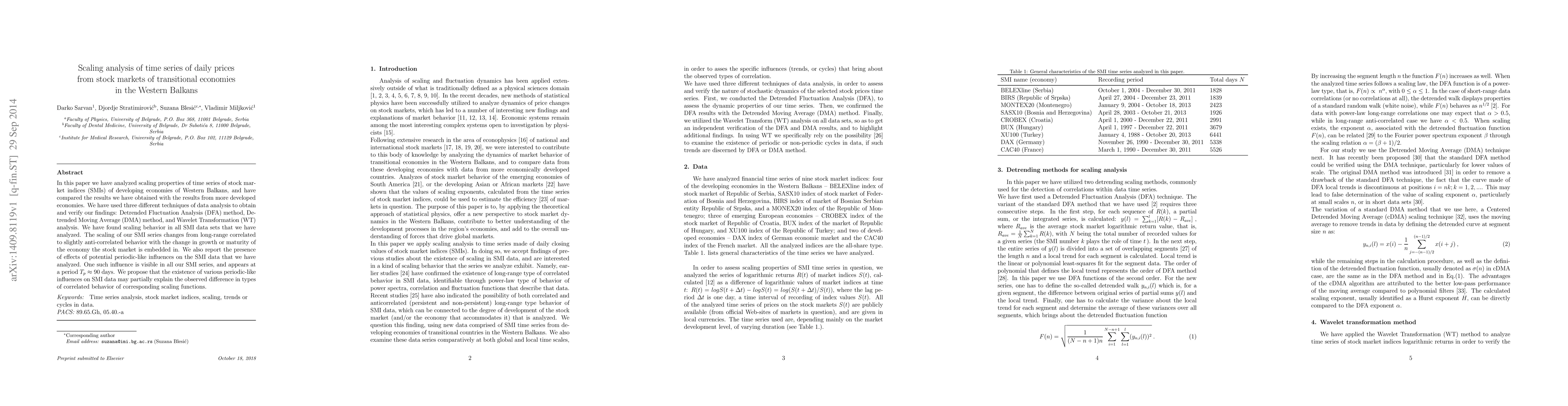 In this paper we have analyzed scaling properties of time series of stock market indices (SMIs) of developing economies of Western Balkans, and have compared the results we have obtained with the results from more developed economies. We have used three different techniques of data analysis to obtain and verify our findings: Detrended Fluctuation Analysis (DFA) method, Detrended Moving Average (DMA) method, and Wavelet Transformation (WT) analysis. We have found scaling behavior in all SMI data sets that we have analyzed. The scaling of our SMI series changes from long-range correlated to slightly anti-correlated behavior with the change in growth or maturity of the economy the stock market is embedded in. We also report the presence of effects of potential periodic-like influences on the SMI data that we have analyzed. One such influence is visible in all our SMI series, and appears at a period $T_{p}\approx 90$ days. We propose that the existence of various periodic-like influences on SMI data may partially explain the observed difference in types of correlated behavior of corresponding scaling functions.